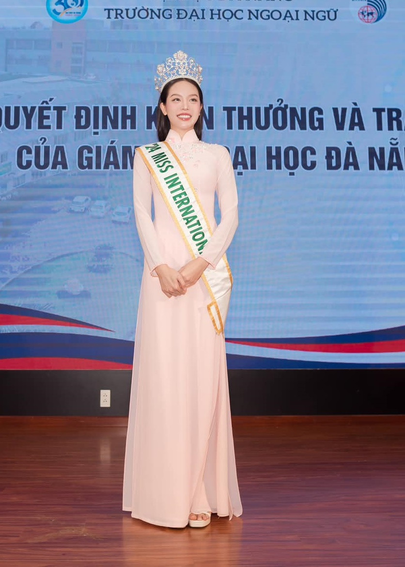 Sau khi trở thành Miss International 2024, Hoa hậu Thanh Thủy thường xuyên mặc áo dài trong nhiều hoạt động. Đó thường là những thiết kế có màu sắc ngọt ngào như hồng, trắng với kiểu dáng đơn giản, nhẹ nhàng giúp tôn lên vẻ đẹp trong trẻo của nàng hậu.