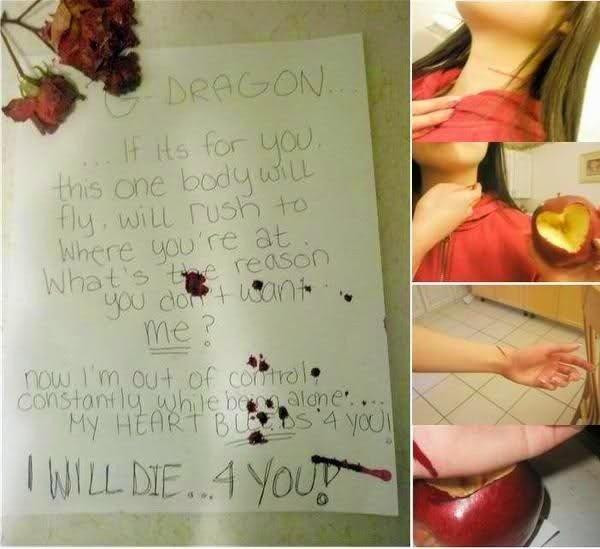 Thế vẫn chưa đủ, fan cuồng còn dọa sẽ đi tìm cái chết nếu không được đáp lại tình cảm. Một fan cuồng của G-Dragon từng viết thư đe dọa rằng cô ta sẽ tự tử, bởi vì G-Dragon không nhận ra cô ta giữa đám đông. Nhằm tăng thêm độ đe dọa, fan này còn nhỏ thêm vài giọt máu vào lá thư.