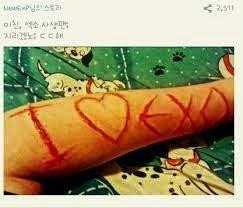 Cách bày tỏ tình cảm bằng quà hay thiệp, email, tin nhắn quá tầm thường với fan cuồng. Họ thích tạo ra thông điệp bằng những cách đáng sợ hơn nhiều. Một fan cuồng của EXO đã từng rạch chữ I love EXO lên cánh tay mình rồi chụp ảnh gửi cho các chàng trai.