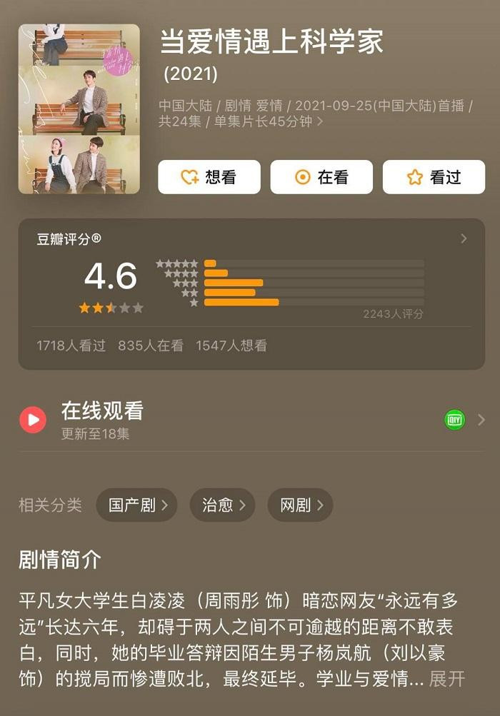 Nhưng khi phim lên sóng, ngay cả “người qua đường” cũng không thể khen nổi Khi Tình Yêu Gặp Nhà Khoa Học. Trên trang Douban, phim được chấm 4.6 điểm, với tỉ lệ 1 sao áp đảo.