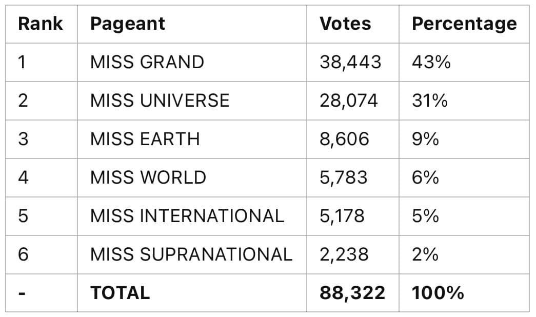 Nếu như Miss Cosmo nhảy vọt thì Miss Grand International vốn là Quán quân của lần bỏ phiếu trước nay tụt xuống thứ 3 với 9% phiếu bầu. Netizen cho rằng không phải Miss Grand International giảm sức hút, mà những phát ngôn gây tranh cãi của chủ tịch Nawat đã làm khán giả ngày càng mất thiện cảm với cuộc thi do ông sáng lập.