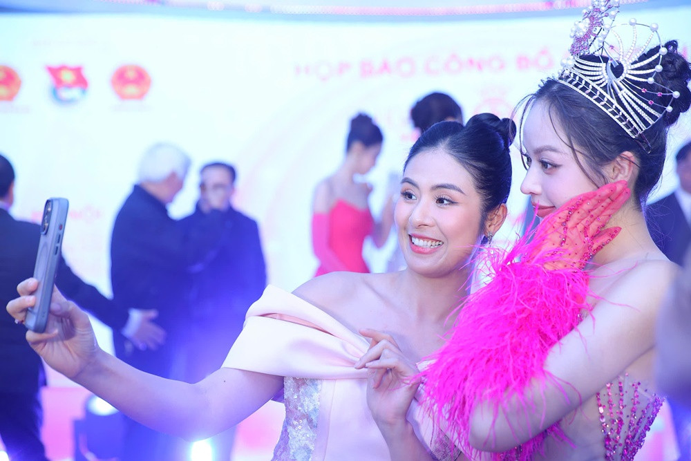 Hoa hậu Việt Nam 2010 Ngọc Hân hào hứng chụp selfie với Hoa hậu Việt Nam 2022 Thanh Thủy. Hai nàng hậu hiếm khi có dịp gặp gỡ nhưng đã nhanh chóng trở nên thân thiết. Dù đăng quang cách nhau tới 12 năm nhưng Ngọc Hân vẫn rất trẻ trung khi đứng cạnh đàn em Thanh Thủy.
