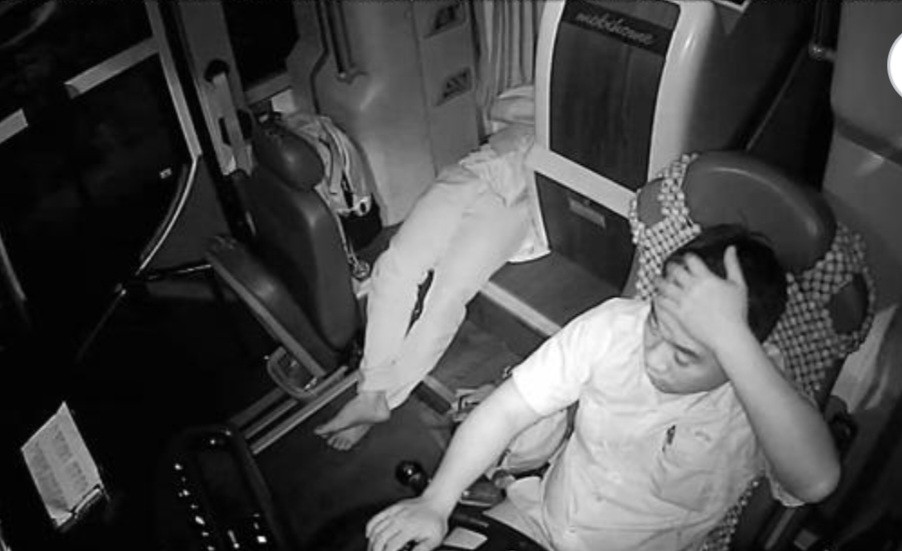 Hình ảnh ghi nhận trong buồng lái xe khách 50F-004.83 cho thấy vài giây trước khi gây tai nạn, dù đang vượt chiếc xe tải phía trước nhưng tài xế Tính điều khiển xe bằng 1 tay (tay phải), tay trái liên tục vuốt mắt, vò đầu rồi giật mình trước khi đâm vào xe khách 16 chỗ.