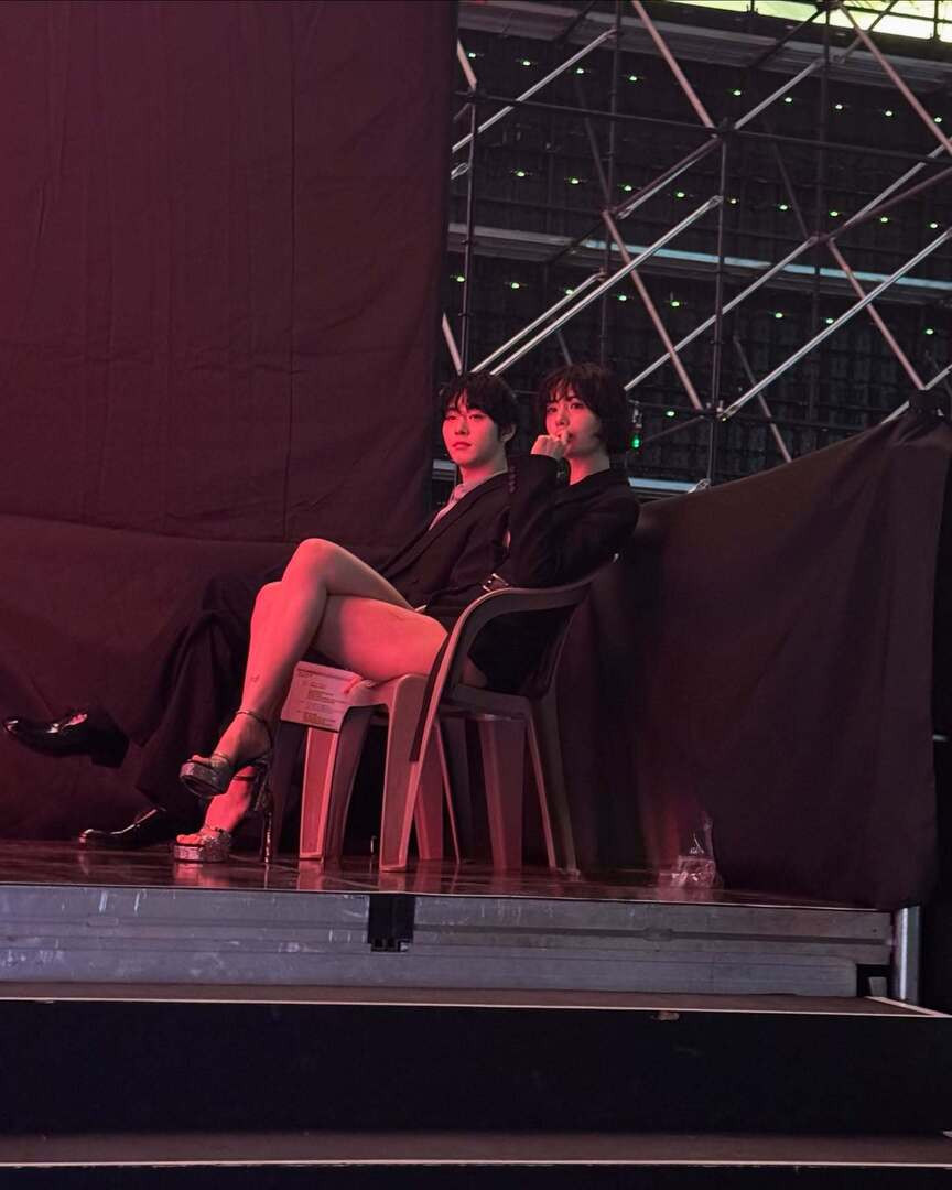 Nữ diễn viên cũng chia sẻ ảnh ngồi đợi trao giải cùng Ahn Hyo Seop. Ánh đèn hậu trường mờ ảo cũng không thể làm "lu mờ" khí chất hệt như một cặp chị em tài phiệt thứ thiệt của hai diễn viên.