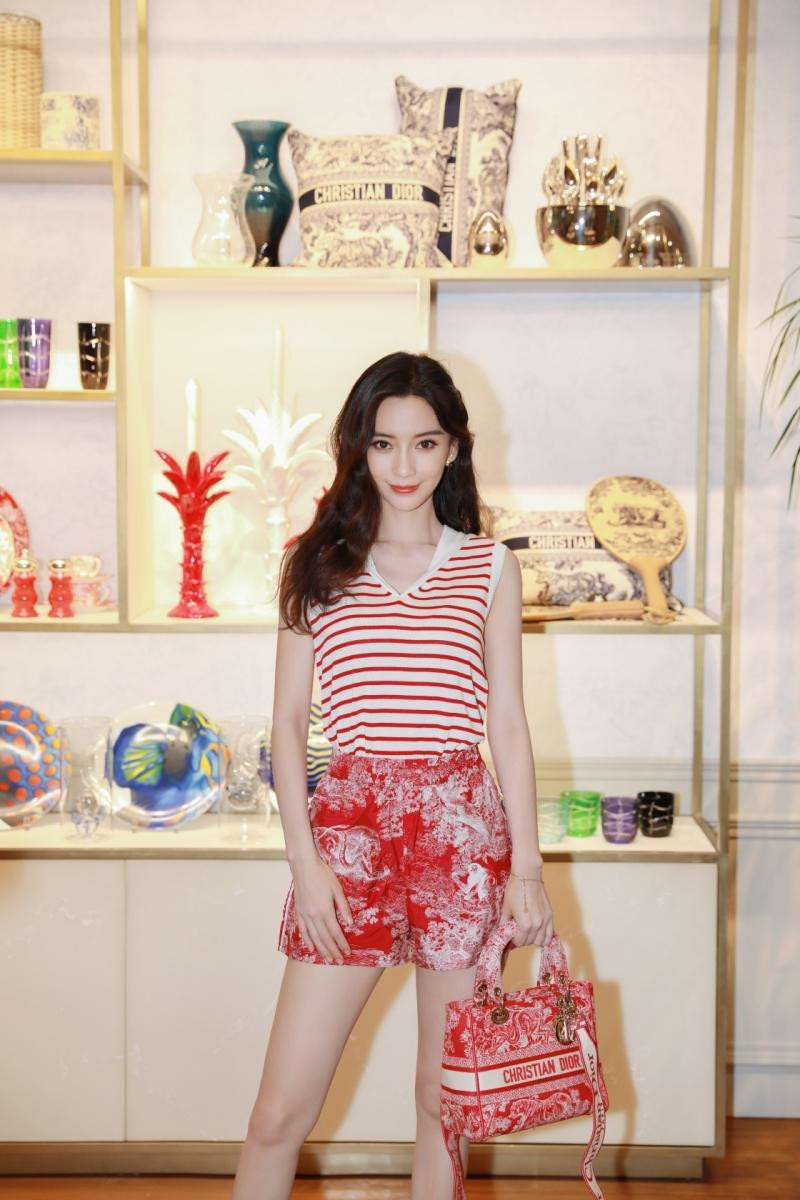 Trước đó, khi xuất hiện trong cửa hàng pop-up của Dior, Angelababy mặc chiếc quần soóc có hoạ tiết tương tự, để tóc xoã đơn giản trông trẻ trung hơn rất nhiều.