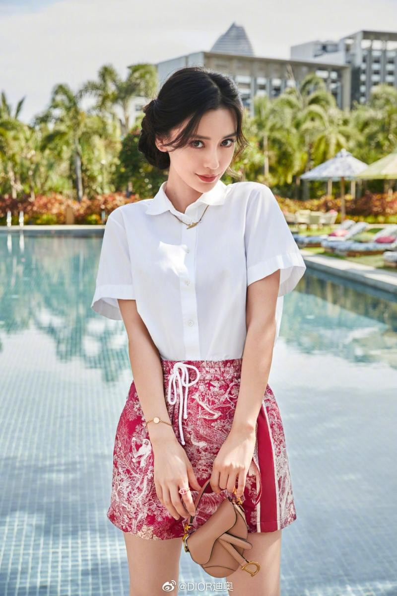 Angelababy được chọn mặc gam màu đỏ, gam màu nổi bật nhất trong 3 gam màu của bộ sưu tập này. Cô mặc chiếc váy ngắn màu đỏ, áo sơ mi trắng, cầm những chiếc túi micro siêu nhỏ, thoải mái tạo dáng bên bể bơi, phong thái nghỉ ngơi thư giãn.
