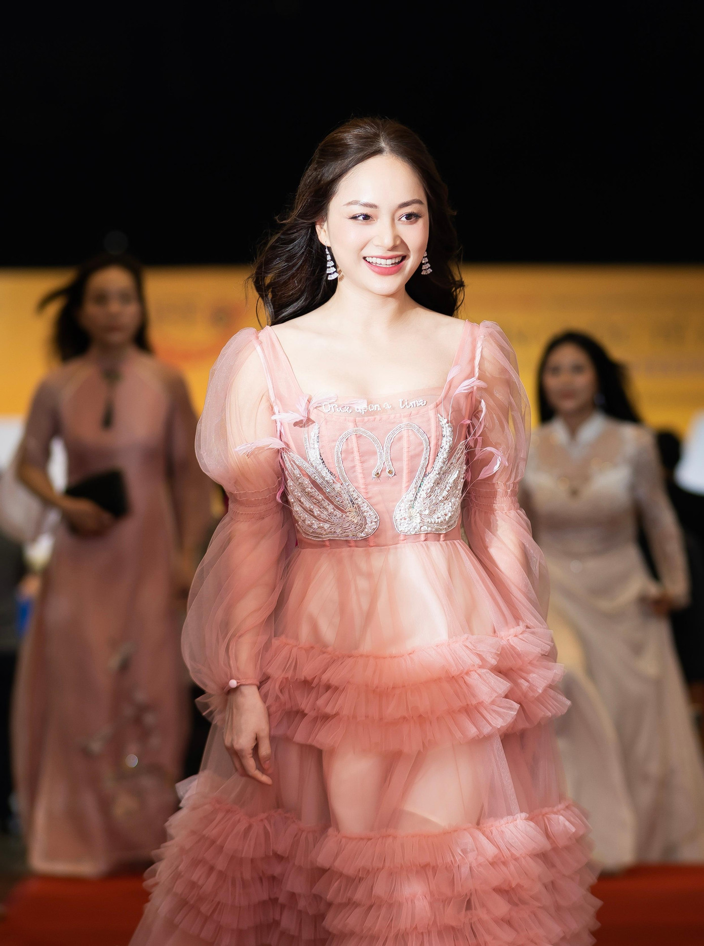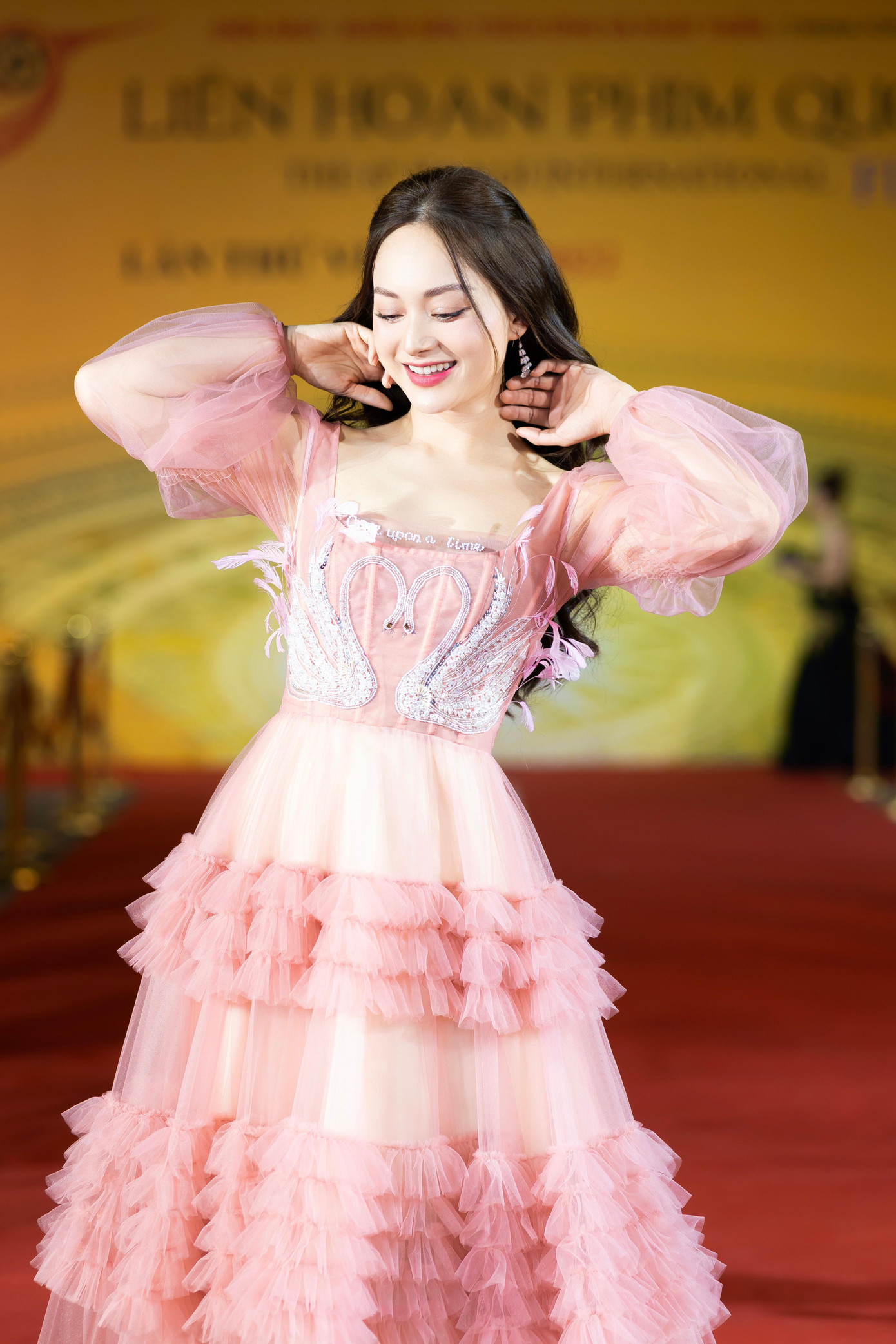 Đến ngày bế mạc Liên hoan phim quốc tế Hà Nội 2022, 'sao' phim Thương ngày nắng về chọn chiếc đầm hồng xếp ly nhẹ nhàng. Phần tay phồng và lối xoã tóc tự nhiên đem đến cảm giác bay bổng cho Lan Phương. Nữ diễn viên gây ấn tượng với phong thái thanh thoát và yểu điệu thướt tha như tiểu thư đài các. Lần này, con gái của Lan Phương tán thưởng mẹ lộng lẫy như công chúa Aurora.