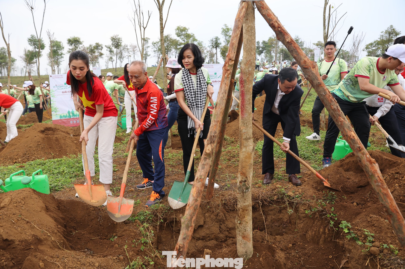 Hoa hậu Việt Nam năm 2018 Trần Tiểu Vy cùng vận động viên điền kinh kỳ cựu, huyền thoại 9 lần vô địch Tiền phong Marathon Bùi Lương tham gia buổi trồng cây.