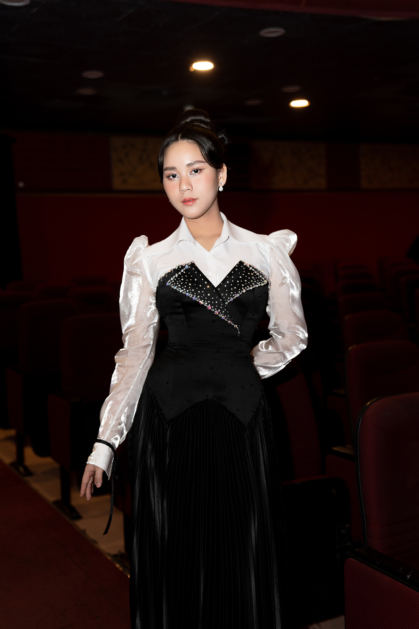 Ngoài phần trình diễn mở màn, Bella Vũ còn đảm nhiệm vai trò MC trong chương trình hòa nhạc lần này. Cô nàng chọn chiếc đầm ấn tượng của nhà thiết kế Nguyễn Minh Tuấn kết hợp cùng mái tóc búi cao thanh lịch. Trang phục kết hợp những yếu tố cổ điển trong phom dáng như áo sơ mi trắng tay bồng, áo corset định hình dáng đồng hồ cát váy xếp ly, cùng với các nét phá cách như phần áo corset giả cổ áo sơ mi và đính hạt đá tạo độ mềm mại nhưng vẫn cá tính.