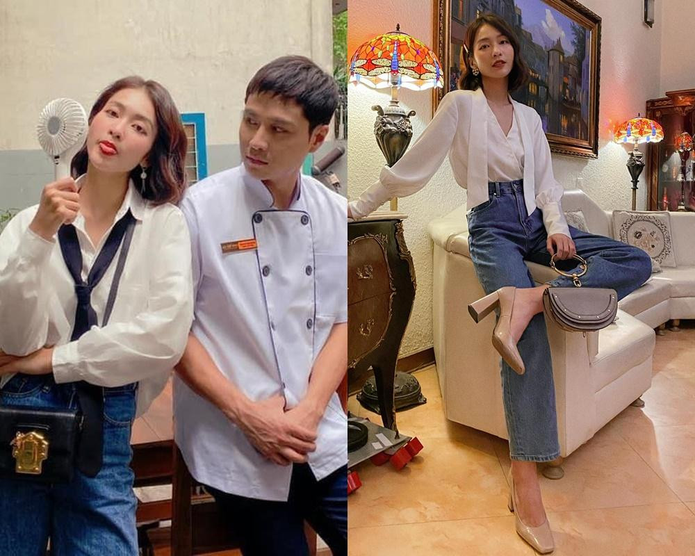 Quần jeans ống suông kèm áo sơ mi cách điệu cũng là công thức cơ bản mà cực kỳ hiệu quả để Khả Ngân tỏa sáng trên phim.