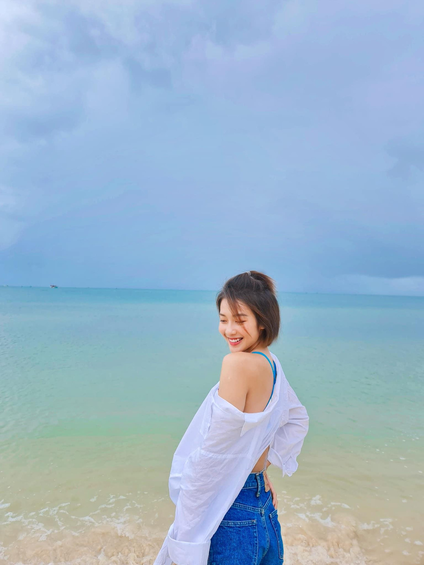 Cũng là diện bikini ra biển nhưng Khả Ngân lại khoác thêm sơ mi trắng bên ngoài nhìn đầy phóng khoáng và nổi bật. Đây chính là gợi ý cho những cô nàng không thích hở quá nhiều khi diện đồ bơi.