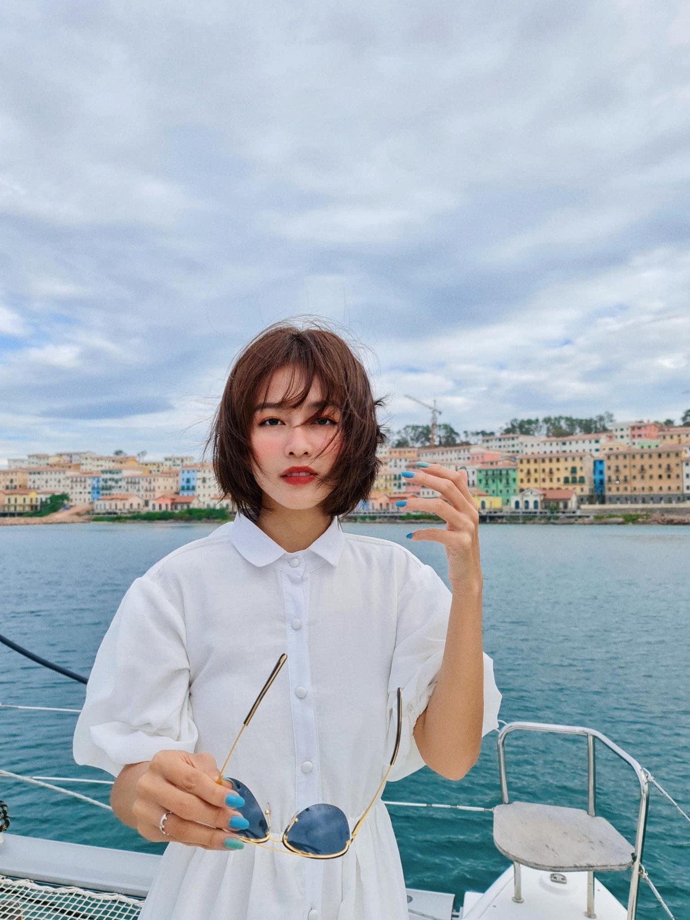 Khả Ngân rất tự hào về vòng eo săn chắc lộ rõ cơ bụng số 11 của mình nên rất chuộng áo crop-top khoe trọn eo thon. Cô luôn chọn những thiết kế có điểm nhấn thú vị như mẫu áo trắng bất đối xứng này.