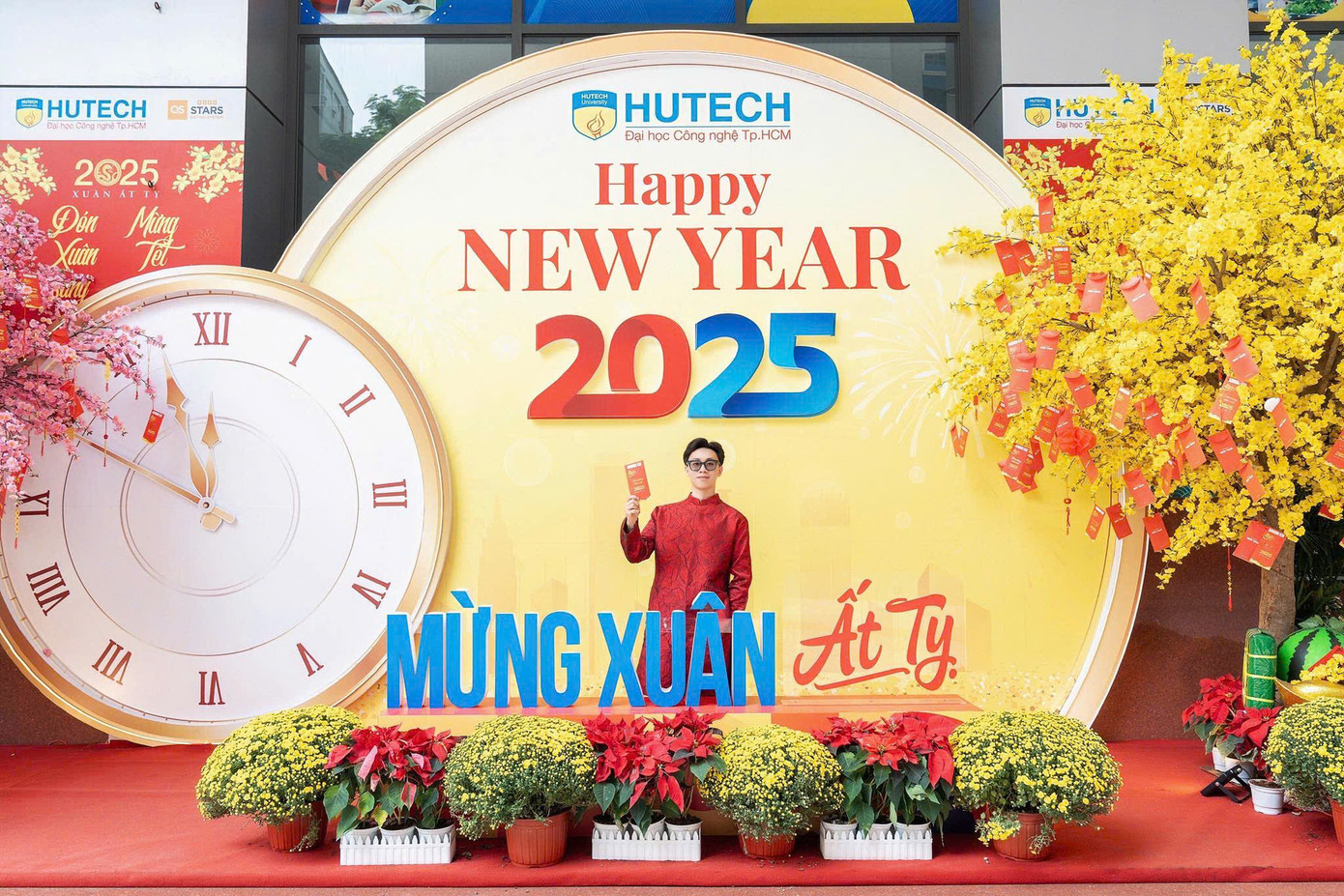 Bên cạnh đó, không gian Tết tại trường ĐH Công nghệ TP. HCM cũng theo phong cách Tết truyền thống, đồng thời được lồng ghép những dấu ấn hiện đại bên trong bối cảnh. Chủ đạo của không gian sử dụng các gam màu như đỏ, vàng và xanh dương, tượng trưng cho sự may mắn, thịnh vượng và tươi sáng trong dịp năm mới. Điểm nhấn nổi bật là cây mai vàng lớn được trang trí bằng các bao lì xì đỏ, một chiếc đồng hồ lớn với kim chỉ gần 12h, gợi nhắc thời khắc Giao thừa ý nghĩa.
