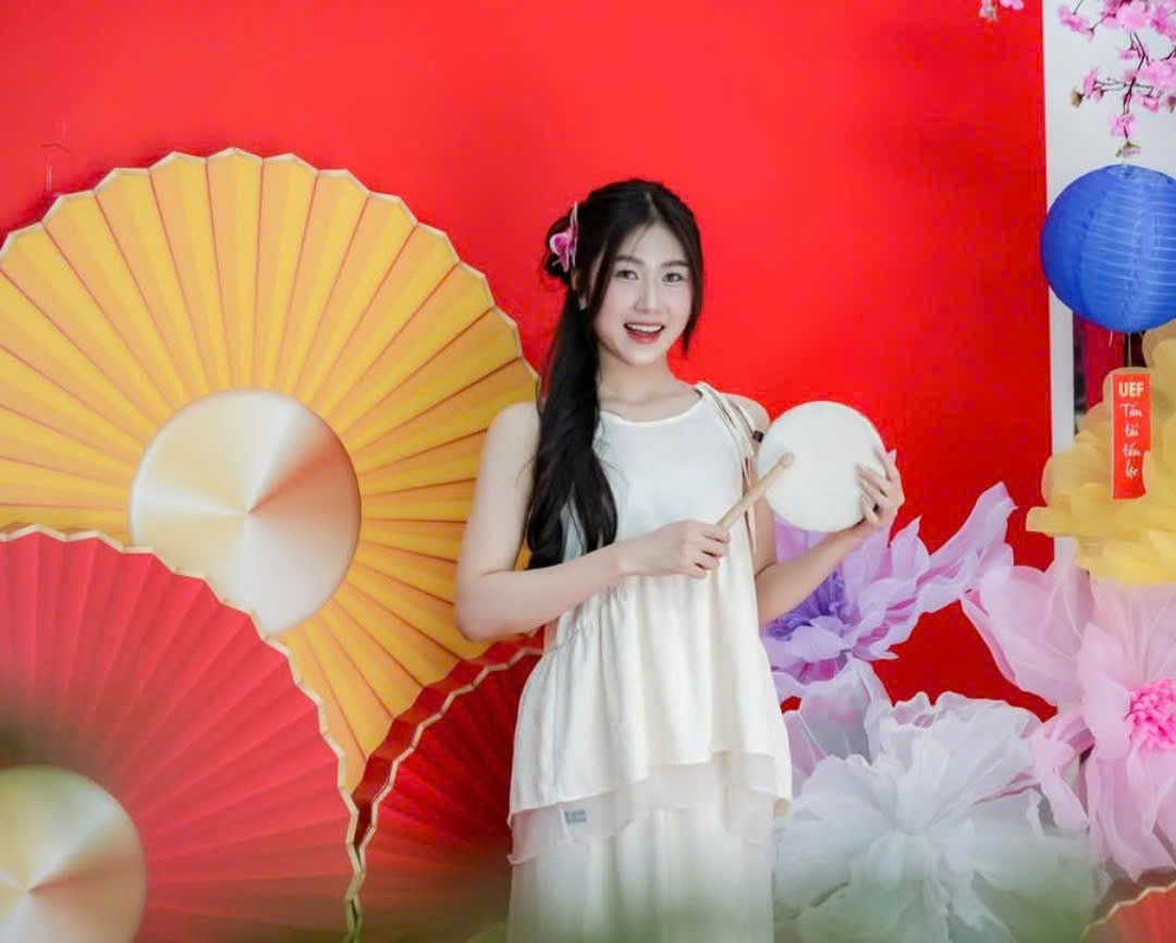 | Sinh viên đầu tư thêm trang phục để check-in không gian Tết tại trường ĐH Kinh tế - Tài chính TP. HCM. |