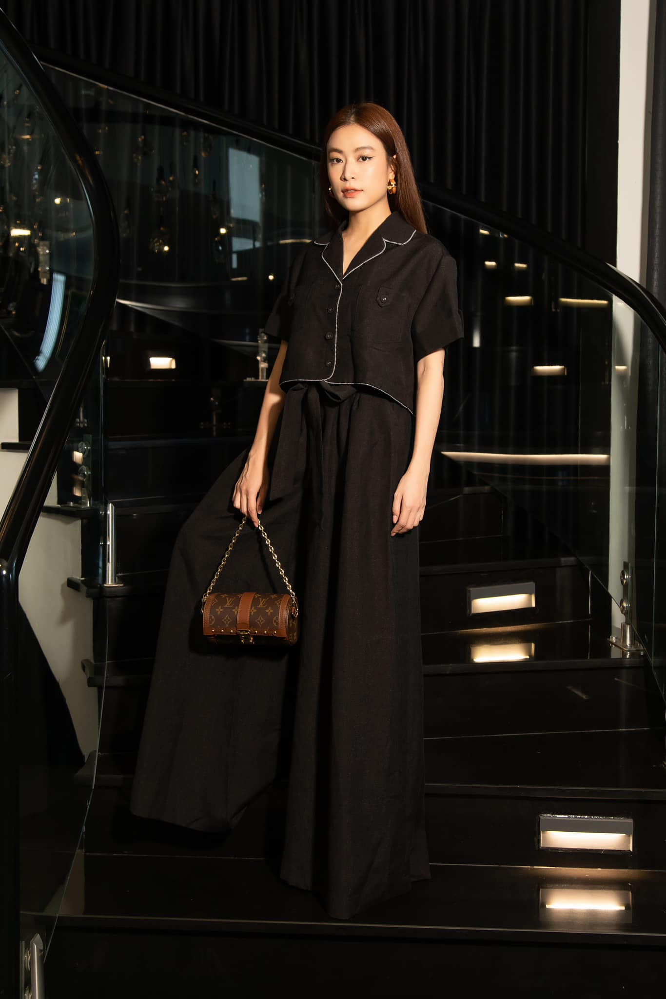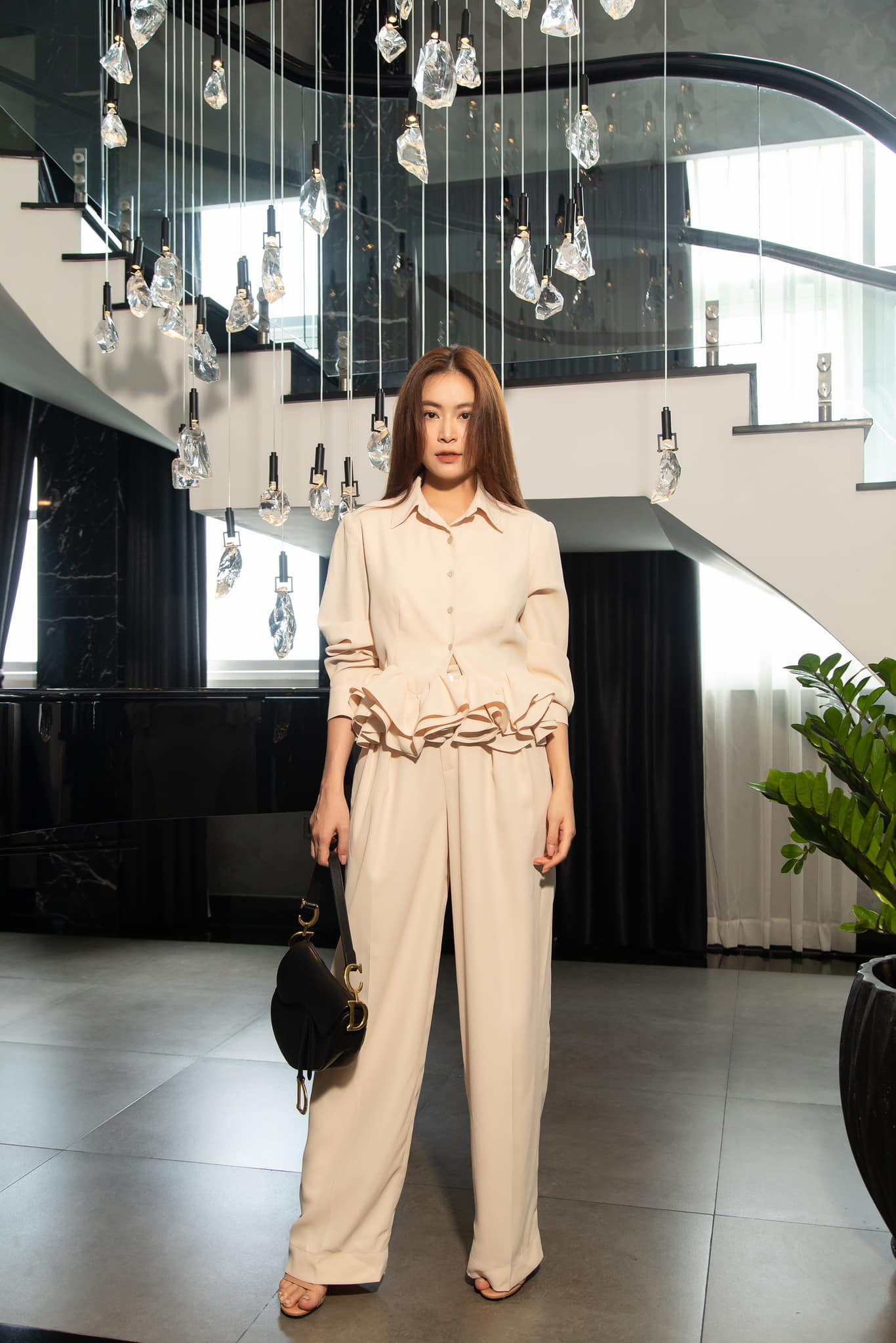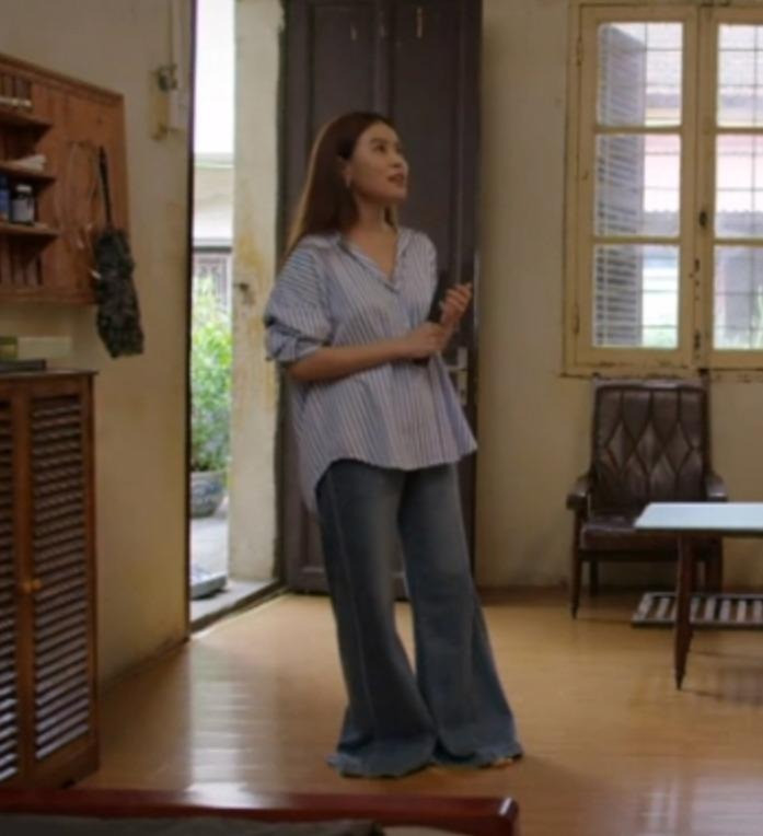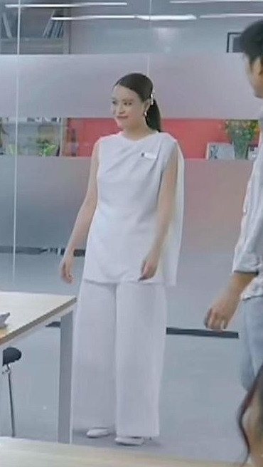 Hoặc trong một cảnh khác, Hoàng Thùy Linh cũng diện combo quần suông và áo dài rộng không hề tôn dáng mà khiến cô bị cộng thêm cả chục tuổi.