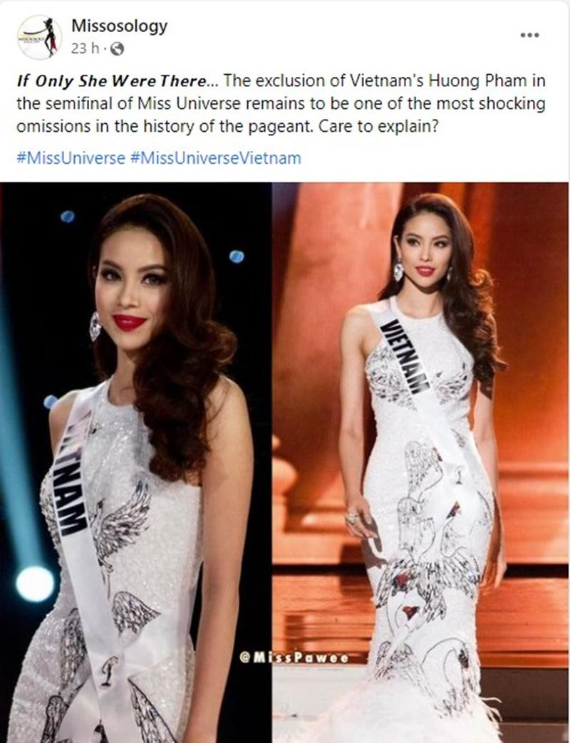 Ngay sau đó, Missosology tiếp tục đăng tải hình ảnh Hoa hậu Phạm Hương trong cuộc thi Miss Universe 2015, kèm lời chia sẻ đầy tiếc nuối: Việc loại đại diện của Việt Nam là Hương Phạm khỏi danh sách Bán kết của Miss Universe là một trong những thiếu sót nhất trong lịch sử cuộc thi. Có ai quan tâm đến việc giải thích cho điều này không?