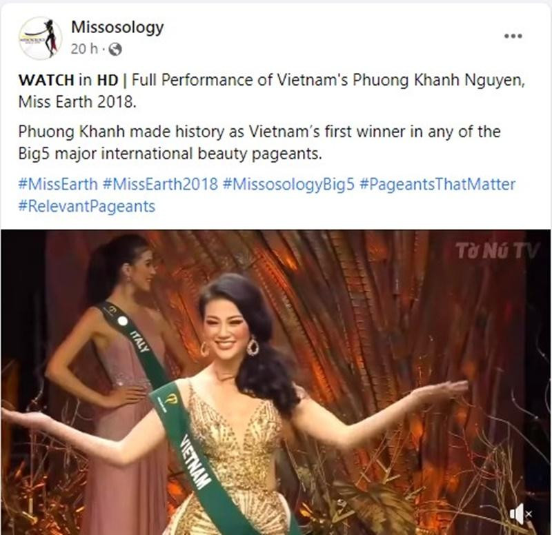Sự việc còn bùng nổ hơn khi Missosology thậm chí không hề dừng lại, mà tiếp tục đăng tải video các phần trình diễn của người đẹp Phương Khánh tại Miss Earth 2018 ngay sau bài post về Hoa hậu Phạm Hương. Hoa hậu Phương Khánh cũng là đại diện đầu tiên của Việt Nam làm nên lịch sử khi đăng quang ngôi vị cao nhất tại đấu trường Miss Earth.