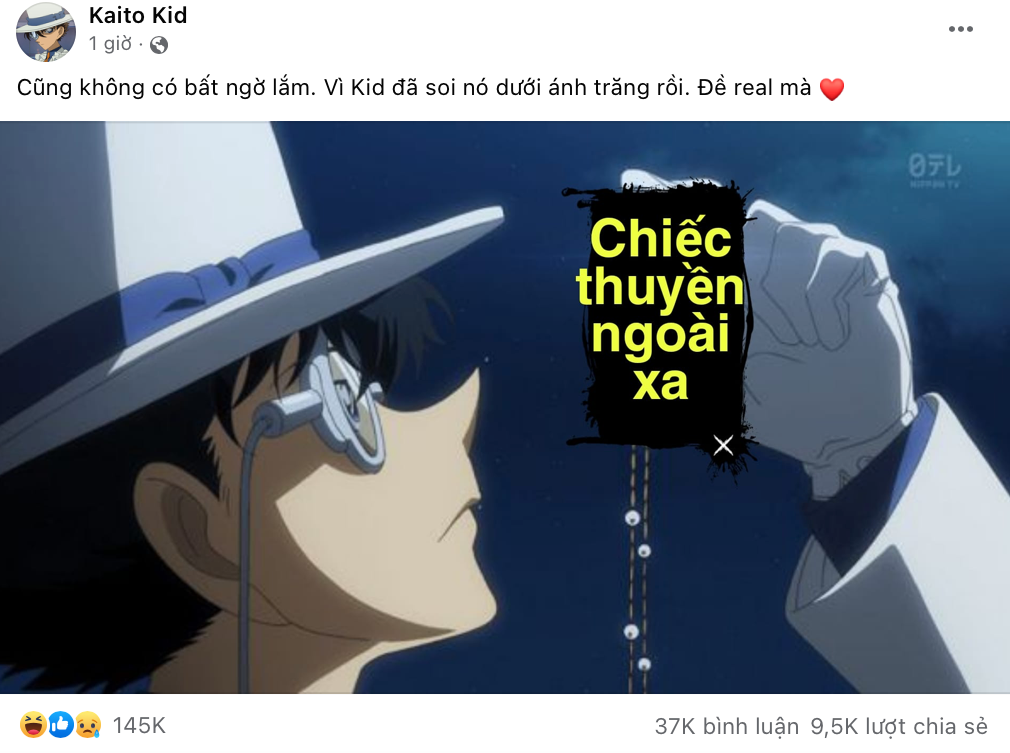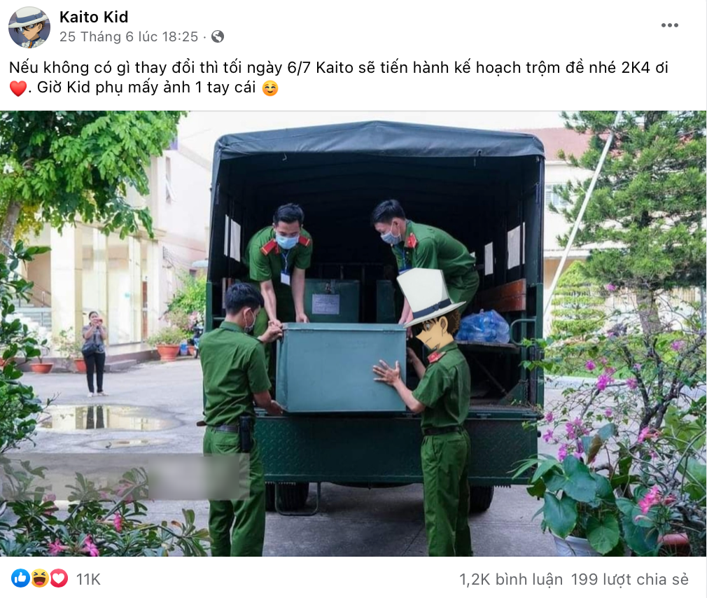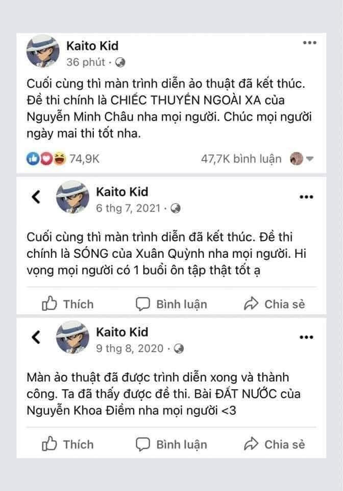 Fanpage của Kaito Kid hiện đang có hơn 335K lượt theo dõi. Ở phần giới thiệu, fanpage này ghi nội dung "Trộm đề THPT Quốc gia". Netizen kháo nhau rằng 3 năm qua, Kaito Kid đã đoán trúng liên tiếp đề thi khiến cộng đồng mạng không khỏi ngỡ ngàng. Hiện tại, ai nấy đều vô cùng tò mò về danh tính của "thánh đoán đề" khiến mạng xã hội xôn xao.