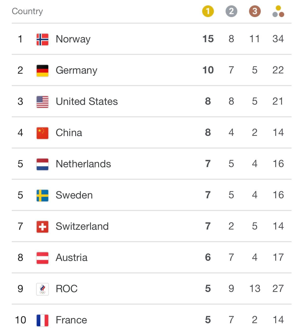 Vẫn còn tới 2 ngày thi đấu nữa để Na Uy đào sâu kỷ lục của mình, nhìn chung vị thế nhất toàn đoàn năm nay khó thoát khỏi tay họ. Trong khi đó, đoàn Trung Quốc đang so kè quyết liệt với đoàn Mỹ để giành vị trí thứ 3. Cả hai hiện có cùng 8 HCV nhưng Mỹ tạm đứng trên do hơn về tổng.