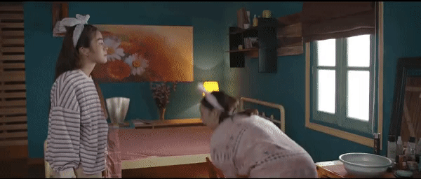 Phim Nhà Trọ Balanha có nội dung vui nhộn như thế nhưng Quỳnh Kool cũng hai lần chịu đau. Đầu tiên, cô bị Trần Vân lao tới ra tay cực bất ngờ như thế này.
