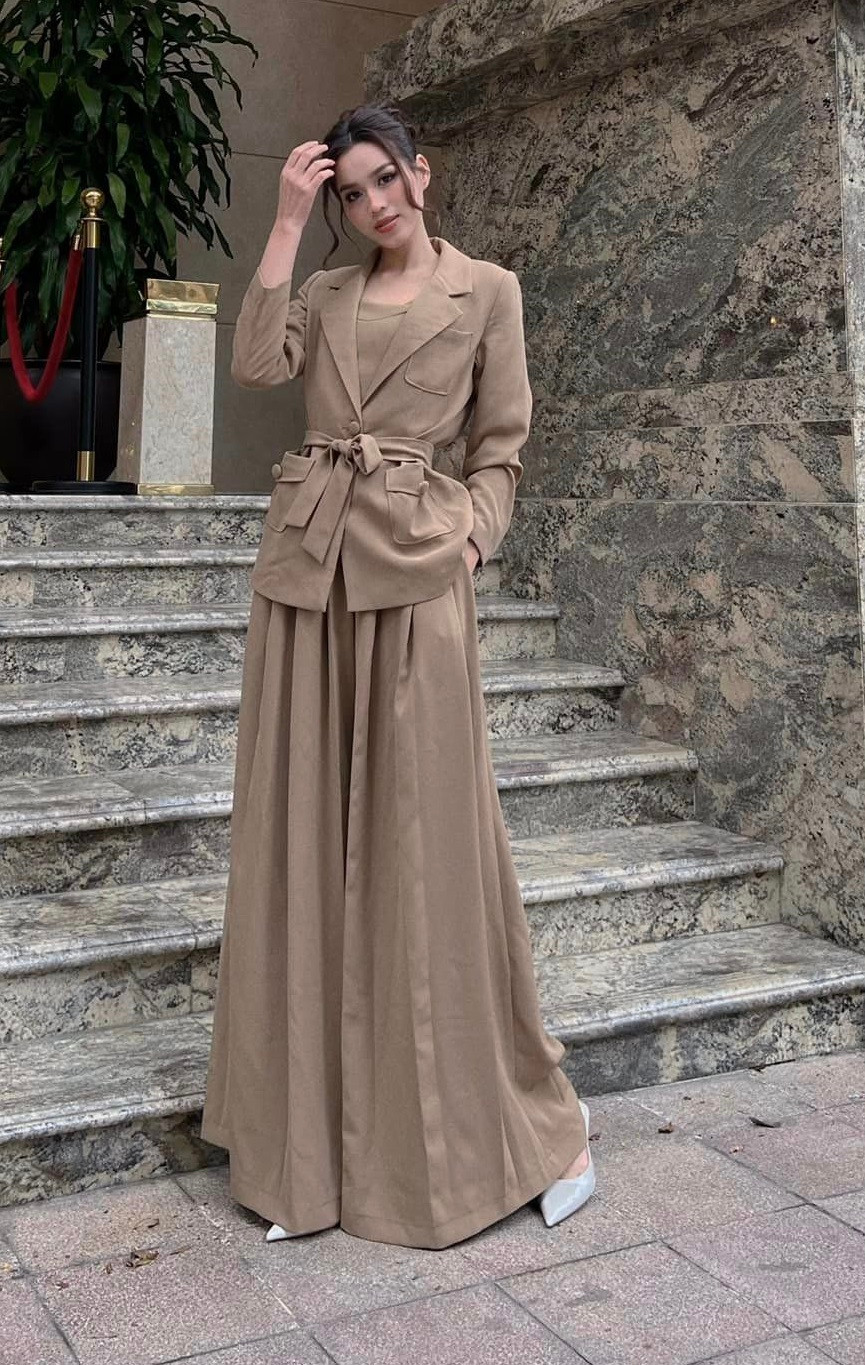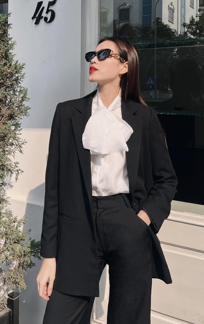 Đỗ Thị Hà từng thổ lộ mong muốn dấn thân vào sự nghiệp kinh doanh, phải chăng vì thế mà nàng hậu bắt đầu chọn những set đồ đậm chất nữ tổng tài như thế này? Set vest đen đi kèm áo thắt nơ bên trong giúp nàng hậu nhìn đầy khí chất mạnh mẽ, cá tính mà vẫn có điểm nhấn tạo vẻ nữ tính.