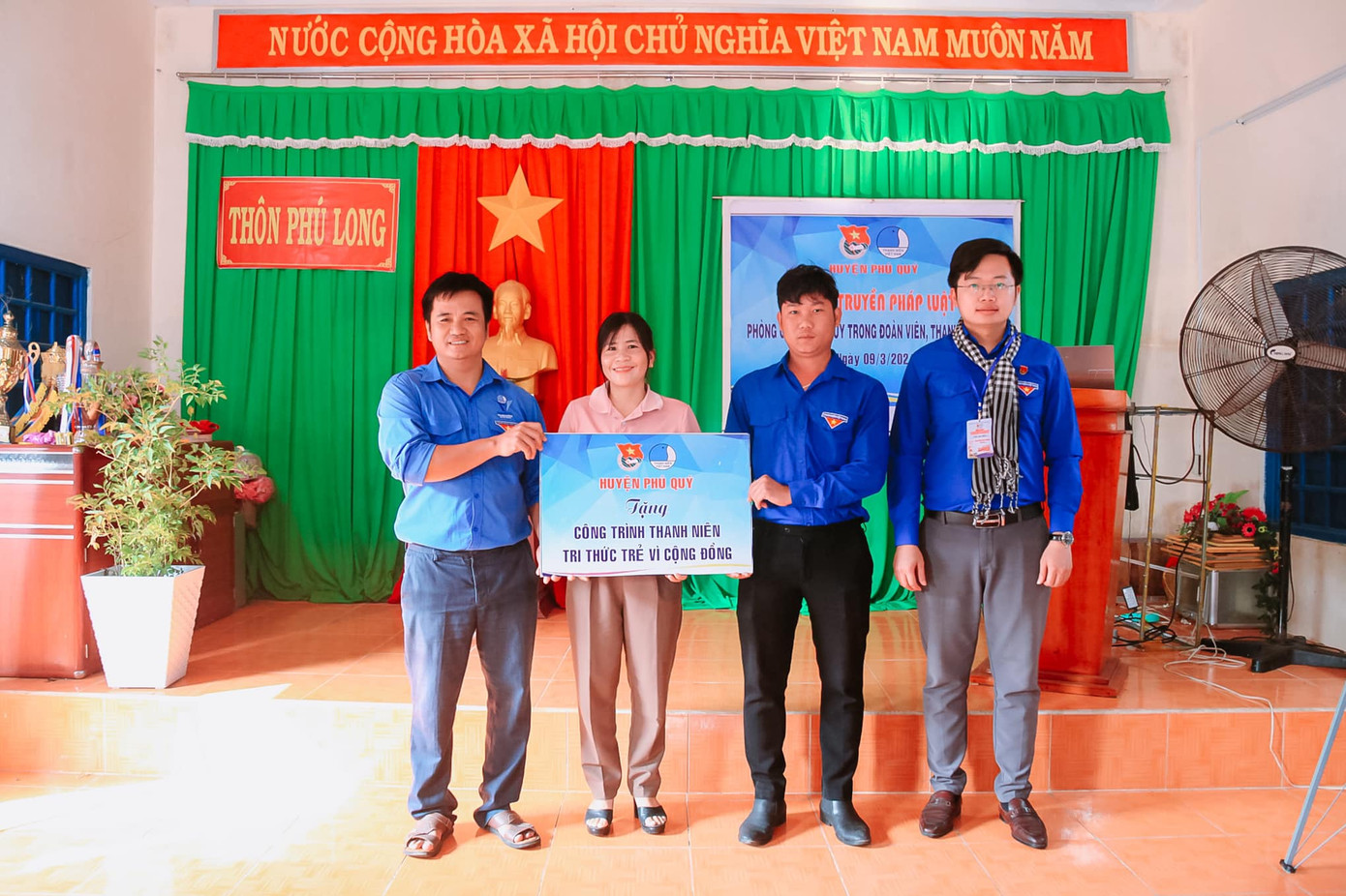 Đoàn công tác cũng đã đến trao quà cho 10 hộ gia đình có hoàn cảnh khó khăn tại thôn Phú Long, xã Phú Long, trao tặng công trình thanh niên “Tri thức trẻ vì cộng đồng” và lắp đặt mạng wifi phục vụ cộng đồng tại thôn. Đặc biệt, đoàn đại biểu đã tổ chức Lễ chào cờ “Tôi yêu Tổ quốc tôi” tại Cột cờ (huyện đảo Phú Quý) - một trong 7 cột cờ chủ quyền được xây dựng trong khuôn khổ Dự án xây dựng Cột cờ chủ quyền Tổ quốc ở các đảo tiền tiêu trải dọc đất nước.