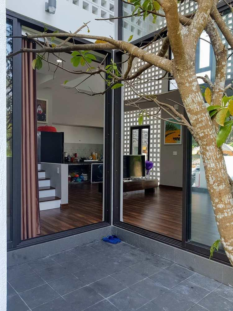 | Điểm nhấn của ngôi nhà là mặt tiền sử dụng đá chẻ và gạch thông gió, Phạm Hùng đã thuê người cưa đá chẻ thành từng khúc nhỏ 3- 4cm để lát mặt tiền của nhà.  | | Còn gạch thông gió từ Huế tạo nên nét duyên dáng cho mặt tiền cũng như thu hút sự chú ý ở khu vực phòng khách. |  | | Không có điều kiện mua sắm đồ đạc, gia đình Phạm Hùng đã sử dụng những vật dụng có sẵn, trong đó bộ bàn ghế bố mẹ tặng được bố trí trong phòng khách mang lại nét thân quen xưa cũ giữa không gian hiện đại. |  | | Phòng ngủ tông màu nâu - trắng và sàn trang trí tông màu trầm ấm, nhẹ nhàng, lãng mạn. |  | | Phạm Hùng lựa chọn sàn nhựa giả gỗ có thể chống nước, chống cháy, chống mối mọt và nhựa cây. |  | | Anh tự tay làm những tấm mica trong các cánh quạt gió phía trước một cách tỉ mỉ.  | | Nhà thoáng mát, nhiều ánh sáng nhờ các ô cửa sổ và gạch thông gió. |  | | Công trình sử dụng những vật liệu quen thuộc nhưng thiết kế lạ mắt với nhiều công năng sử dụng đã thu hút sự quan tâm của nhiều người.  | | Do đó thời điểm Phạm Hùng chia sẻ hình ảnh ngôi nhà của mình lên Facebook vào tháng 12/2016, đã có 25.000 lượt thích, 14.000 lượt chia sẻ và 11.000 lượt bình luận. | | | |
