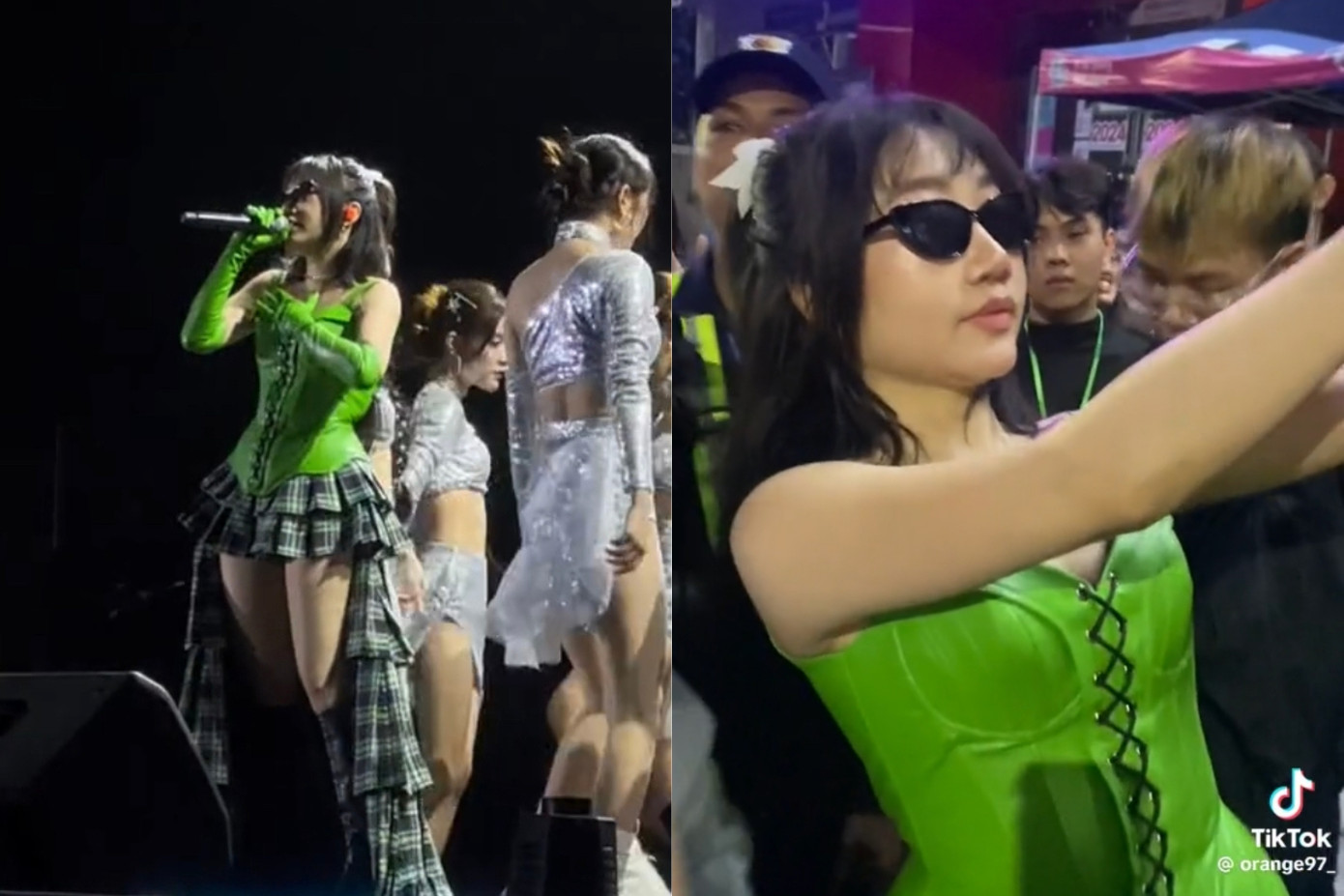 | Bên cạnh biểu cảm bị "hớ" vì pháo hoa chưa nổ, khoảnh khắc nữ ca sĩ nhét micro vào chân váy "không một động tác thừa" để chuẩn bị bắn pháo hoa khiến netizen cười ngất. |