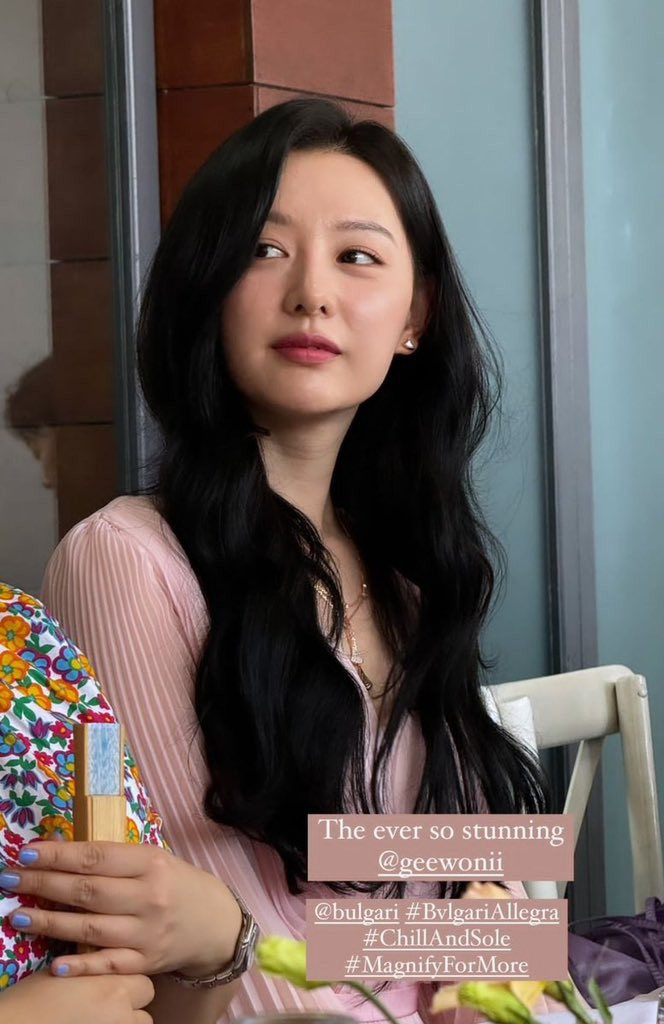 Chiều 14/5, Kim Ji Won đã xuất hiện tươi tắn và ngọt ngào tại sự kiện của BVLGARI. Cô diện chiếc đầm hồng của Max Mara, kiểu tóc giống với tạo hình của Hong Hae In, khiến fan Queen of Tears đùa là Hong Hae In đi công tác nước ngoài.
