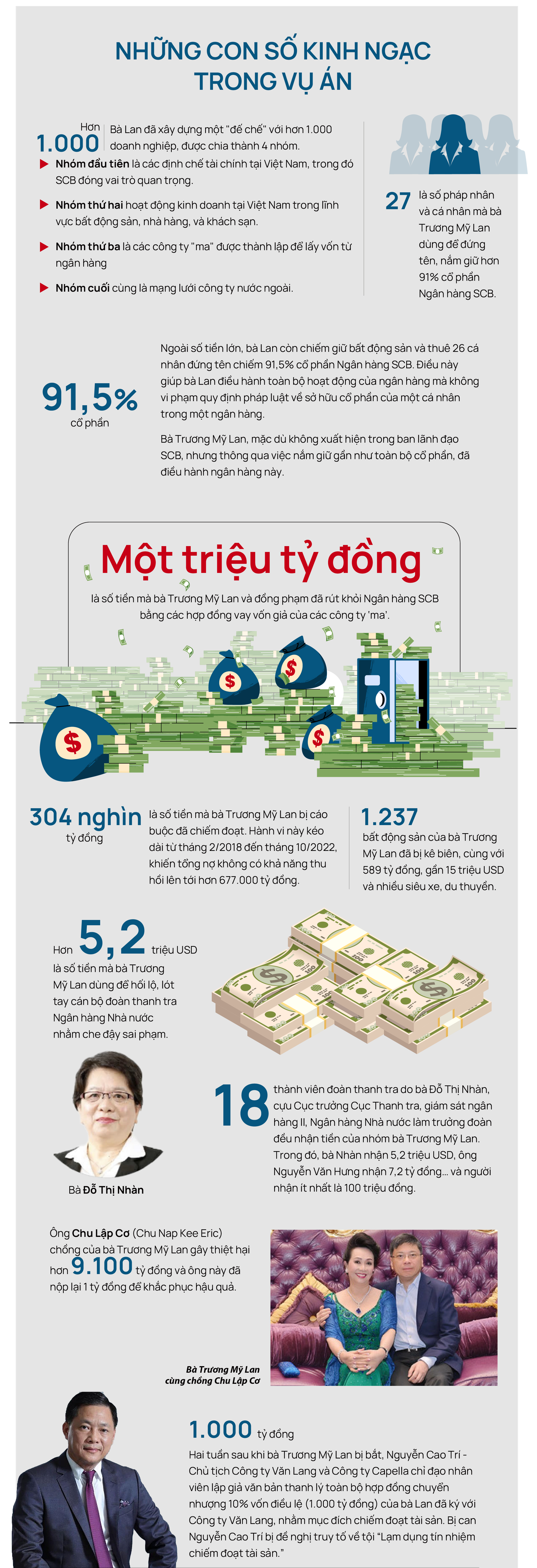 Bà Trương Mỹ Lan - Chủ tịch HĐQT Vạn Thịnh Phát - rút ruột vay từ Ngân hàng TMCP Sài Gòn (SCB) số tiền hơn 1 triệu tỷ đồng và 1.300 khoản vay với dư nợ 677.000 tỷ đồng tại SCB, tạo hồi chuông đáng báo động về sở hữu chéo, cho vay sân sau, cần dứt điểm chặn đứt vòi mạch tuộc rút ruột ngân hàng. Vụ án hé lộ hệ sinh thái 1.000 công ty con của Vạn Thịnh Phát; số bị hại trong vụ việc được xác định là 42.000 nhà đầu tư mua trái phiếu; 45 lãnh đạo, cán bộ ngân hàng SCB và 8 lãnh đạo, cán bộ Ngân hàng Nhà nước bị truy tố.