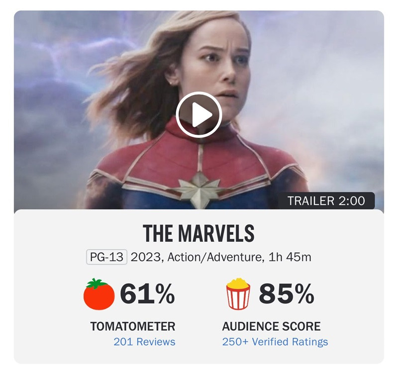 Có vẻ khán giả thế giới cũng có cùng nhận định như khán giả Hàn Quốc. Trên trang Rotten Tomatoes, The Marvels chỉ đạt 61% “độ tươi”, một con số quá thấp so với một phim thuộc MCU và so với sự ngóng đợi của fan hâm mộ toàn cầu.