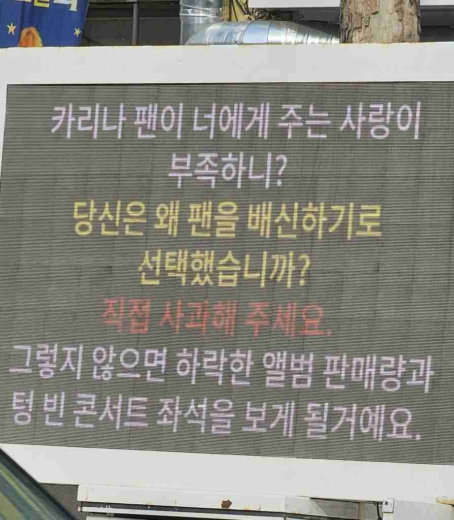 Để thể hiện sự bất bình với Karina vì tin hẹn hò nổ ra, những fan Trung này đã thuê xe tải biểu tình chạy quanh trụ sở SM. Chiếc xe tải chạy dòng chữ: