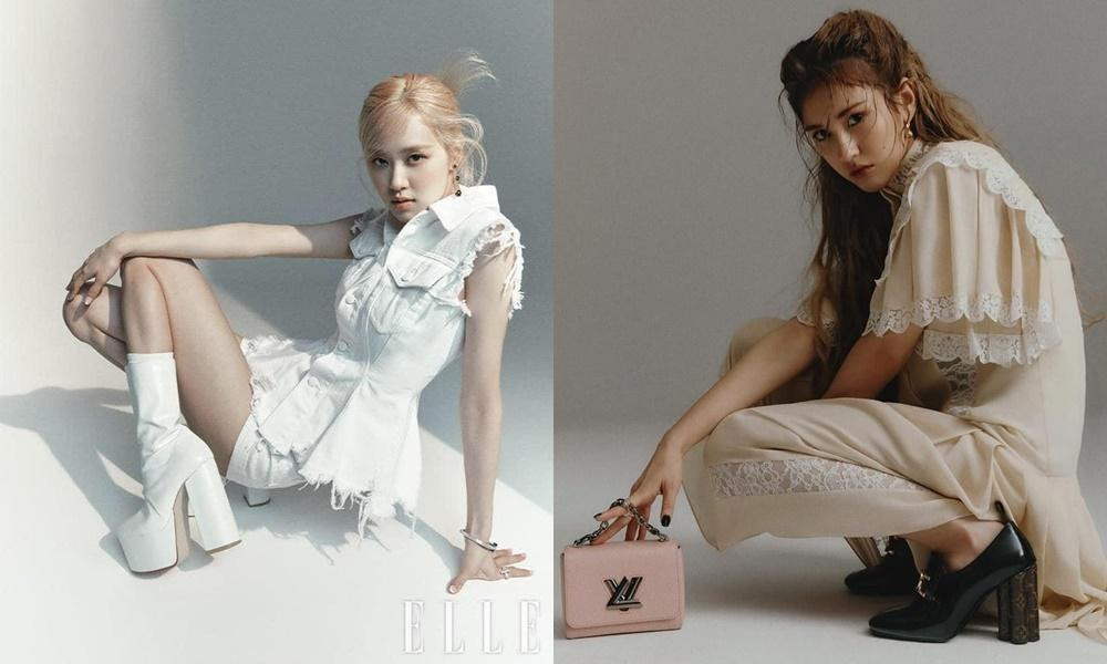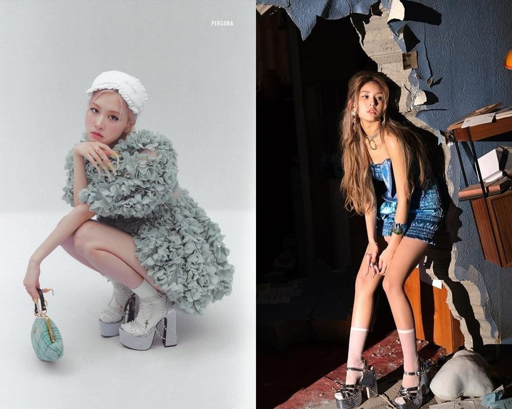 Ngay cả khi chụp hình, Rosé và Jeon Somi cũng có cách phối đồ khá giống nhau với giày cao gót đế vuông cực lớn.