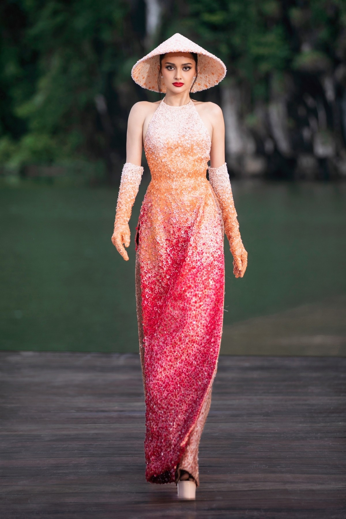 Kỳ Duyên vấn tóc cao, trang điểm nhẹ nhàng, tự nhiên, xinh đẹp nổi bật trong thiết kế áo dài đính đá cổ yếm màu ombre của NTK Lê Thanh Hòa. Nàng hậu cầm theo chiếc nón cũng được đính đá cùng tông với bộ áo dài.