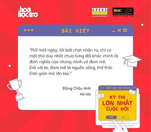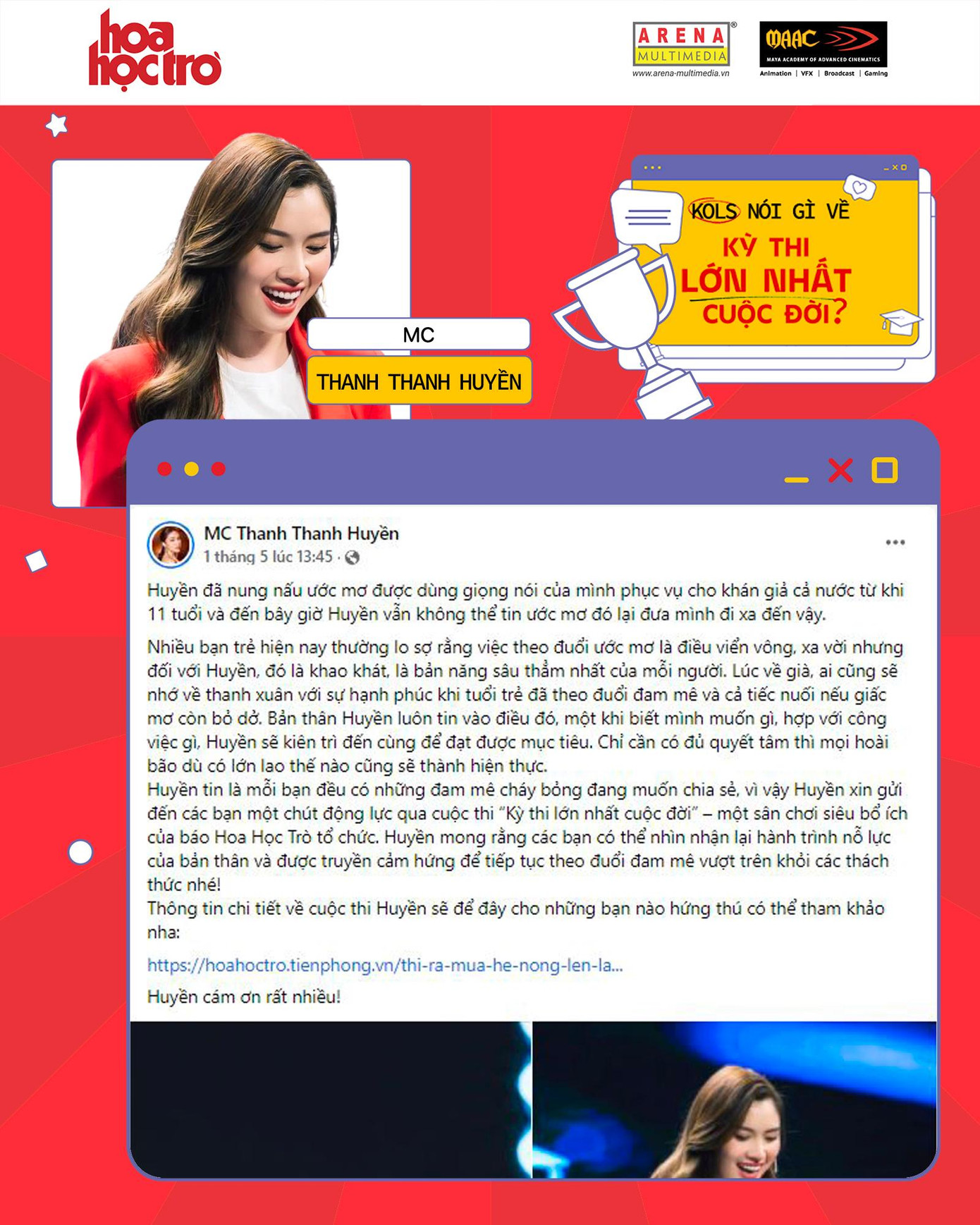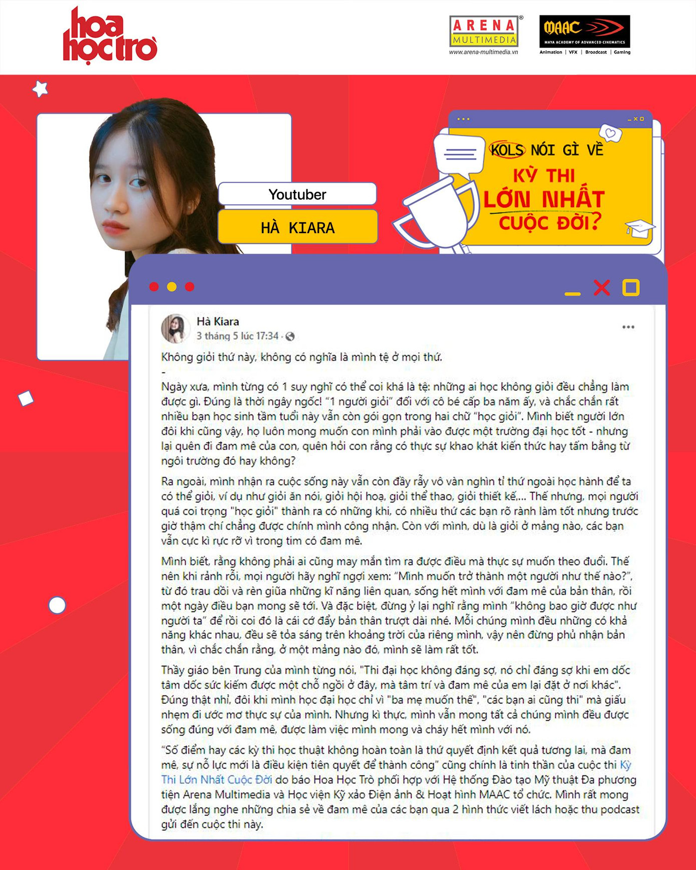 Cuộc thi Kỳ thi lớn nhất cuộc đời với tổng giá trị giải thưởng lên đến 400 triệu đồng do Hoa Học Trò phối hợp cùng Hệ thống Đào tạo Mỹ thuật Đa phương tiện Arena Multimedia và Học viện Kỹ xảo Điện ảnh & Hoạt hình MAAC tổ chức nhằm mục đích cổ vũ, khuyến khích các bạn trẻ Gen Z ở độ tuổi từ 15 đến 22 trên toàn quốc dũng cảm theo vượt qua rào cản định kiến để theo đuổi đam mê thực sự của bản thân. Hạn chót nộp bài viết và podcast dự thi: 15/5/2022.