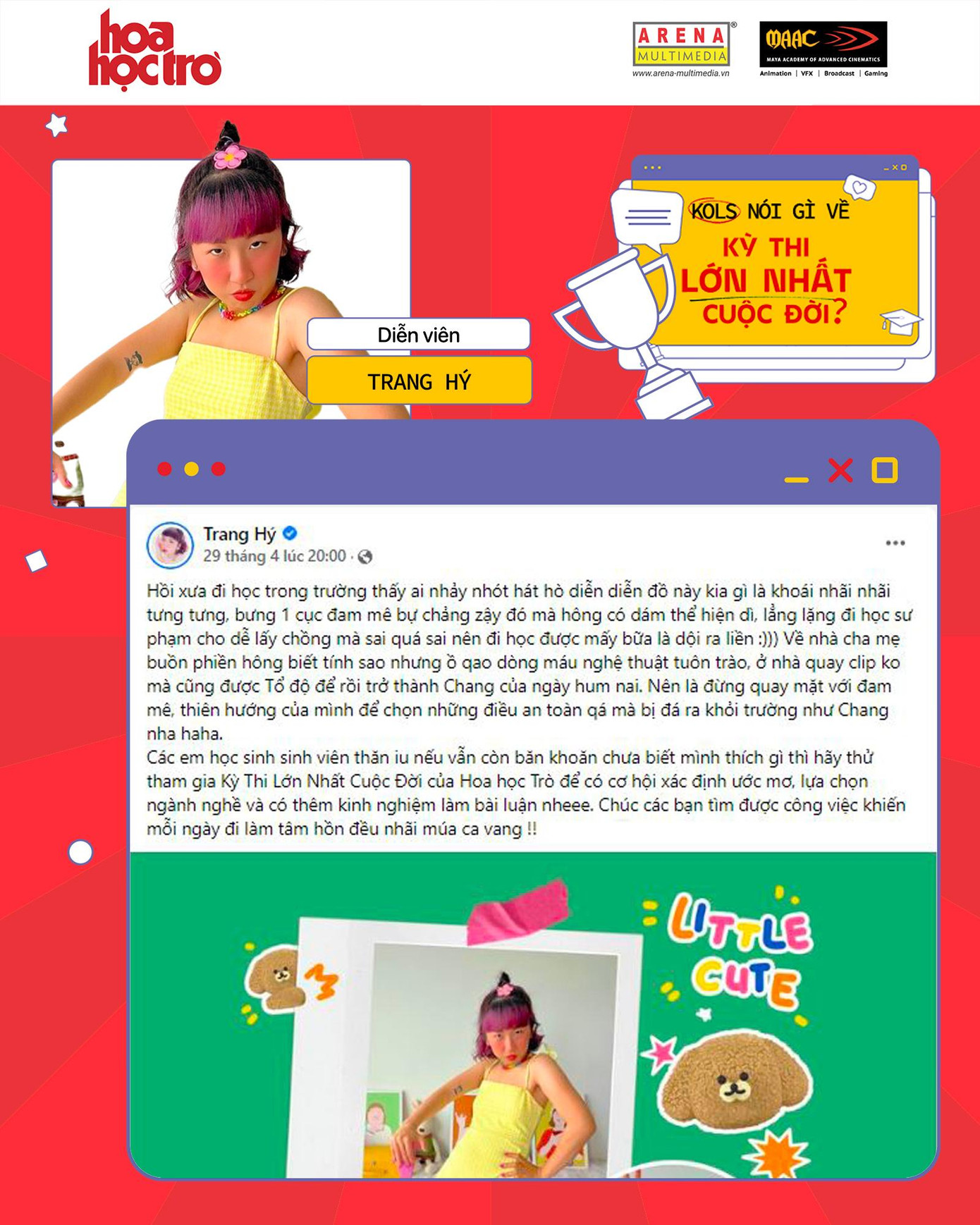 Diễn viên Trang Hý chia sẻ về "kỳ thi lớn nhất cuộc đời" bằng giọng văn vui nhộn, dí dỏm trên trang cá nhân. Theo đó, Trang kể về việc mình từng bỏ qua đam mê để theo học sư phạm “cho dễ lấy chồng”. Nhưng sau tất cả, cô nàng vẫn lựa chọn theo đuổi con đường nghệ thuật để được làm chính mình, mang đến niềm vui cho bản thân và cộng đồng.