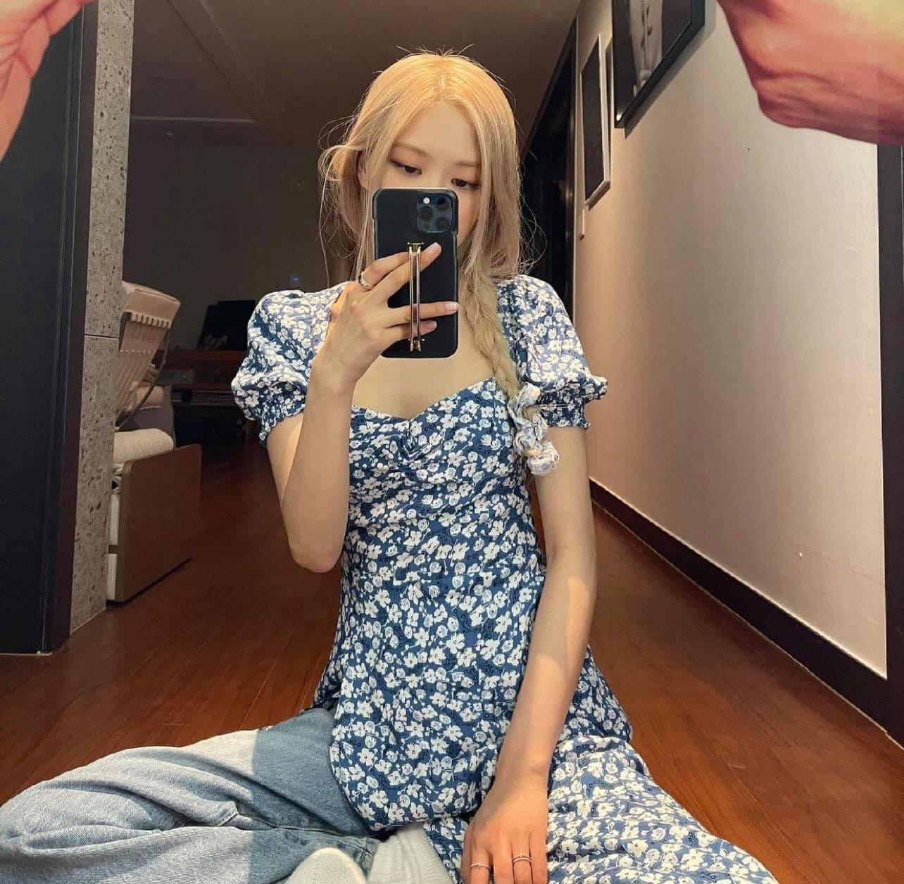 Thời gian gần đây, Rosé cũng đặc biệt hào hứng với cách phối quần dài và váy maxi. Trong show thực tế Sea of Hope, Rosé đã có hai lần mặc theo cách này. Đầu tiên là set đồ váy xanh hoa nhí với quần jeans xanh.