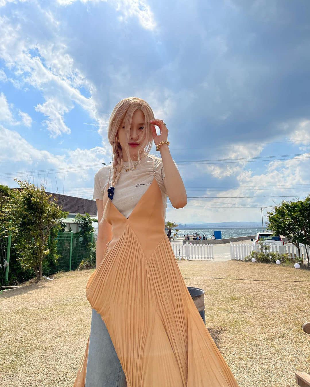 Rosé còn phối áo thun trắng, váy maxi hai dây kèm quần jeans đầy phóng khoáng, rất hợp với một chương trình ghi hình trên bãi biển.