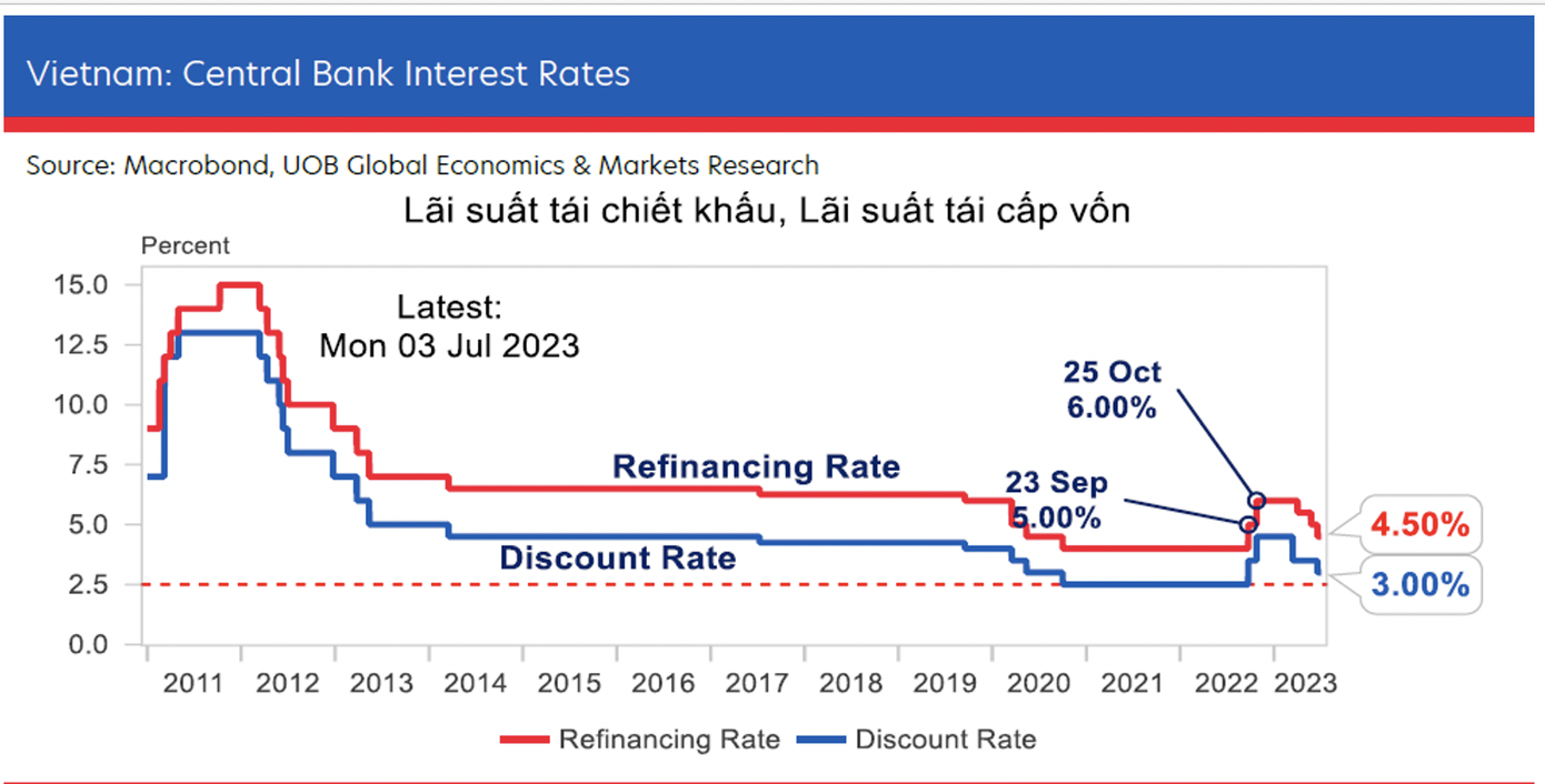 Do tình hình kinh tế còn nhiều khó khăn, Ngân hàng Nhà nước (NHNN) đã phản ứng nhanh chóng bằng cách cắt giảm lãi suất tái cấp vốn tích lũy 150 điểm cơ bản vào tháng 6, xuống còn 4,5%. Dù vậy, Ngân hàng UOB dự báo, sẽ có đợt cắt giảm lãi suất thêm 100 điểm cơ bản nữa (xuống 3,5%) trong quý 4.