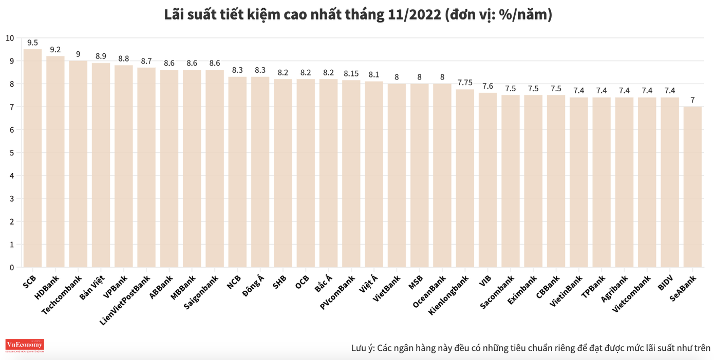Dẫn đầu bảng xếp hạng tháng này là SCB với mức lãi suất lên tới 9,5%/năm. Mức lãi suất niêm yết này đối với kỳ hạn 13 tháng và chỉ áp dụng cho khoản tiền từ 500 tỷ đồng trở lên.