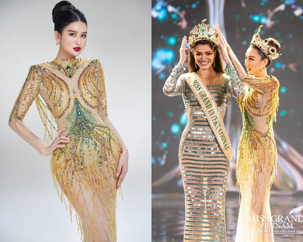 Khi Nguyễn Nga hé lộ bức ảnh cô diện mẫu váy mềm mại ôm sát thân người mang hai màu vàng và xanh lá, khán giả nhanh chóng nhận ra thiết kế này vô cùng quen thuộc. Đây chính là mẫu váy Thùy Tiên đã mặc khi trao lại vương miện cho người kế nhiệm ở chung kết Hoa hậu Hòa bình Quốc tế 2022.