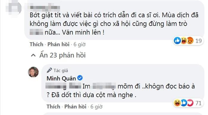 Giữa nhiều bình luận xoay quanh các biện pháp chống dịch thì có một khán giả nhắn nhủ Minh Quân hãy hành động văn minh bằng cách đừng giật tít gây sốc quá và đăng kèm nguồn trích dẫn. Chẳng ngờ, Minh Quân đã bức xúc đáp trả và còn văng tục với người này.