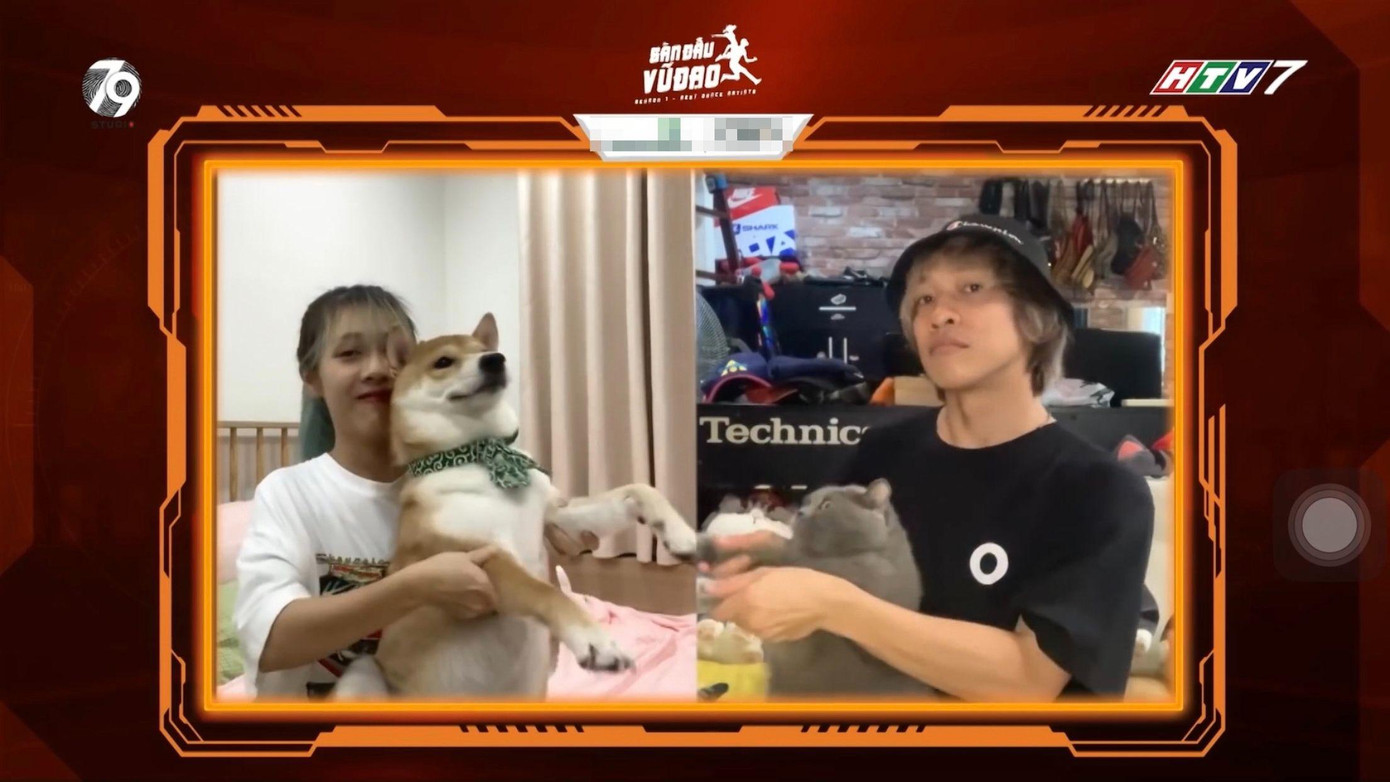 Trong vòng đấu này, team Quê hương của cô nàng vlogger hài hước Hậu Hoàng đã mang đến phần thi cực đáng yêu. Bên cạnh những động tác thuần thục và thần thái "lầy vô đối" thường thấy, Hậu Hoàng - Ngọc Tân còn "rủ rê"... thú cưng cùng nhập hội. Nếu chú chó Shiba của Hậu Hoàng khoe động tác chắc khỏe thì chú mèo lông xám của Ngọc Tân lại dẻo dai không kém.