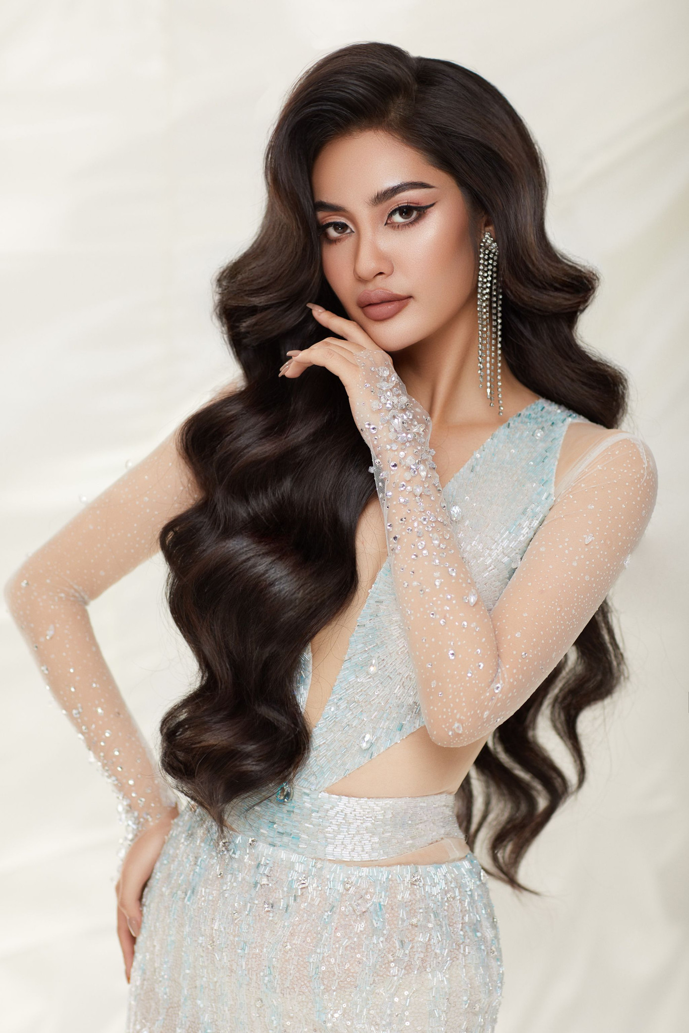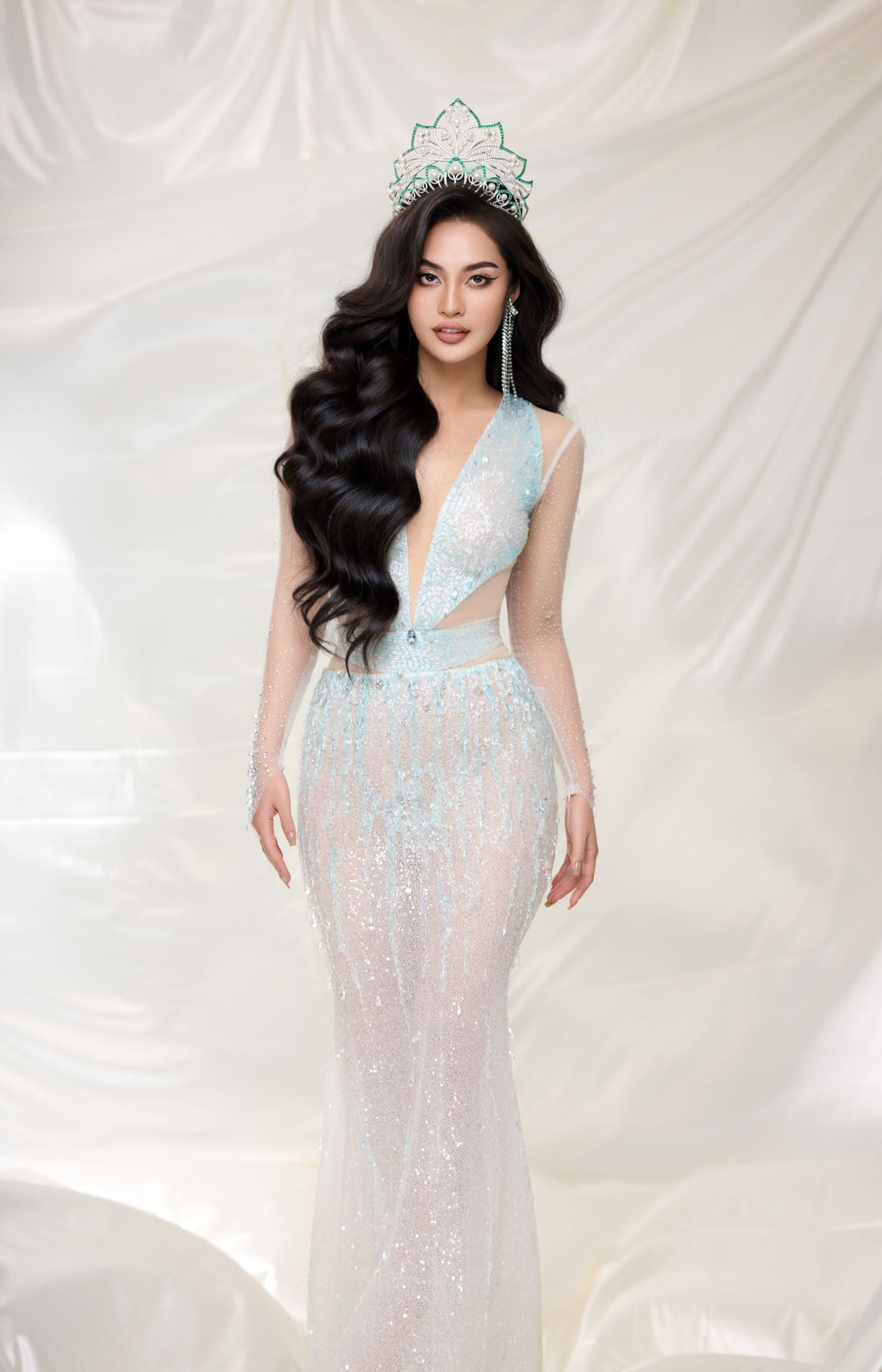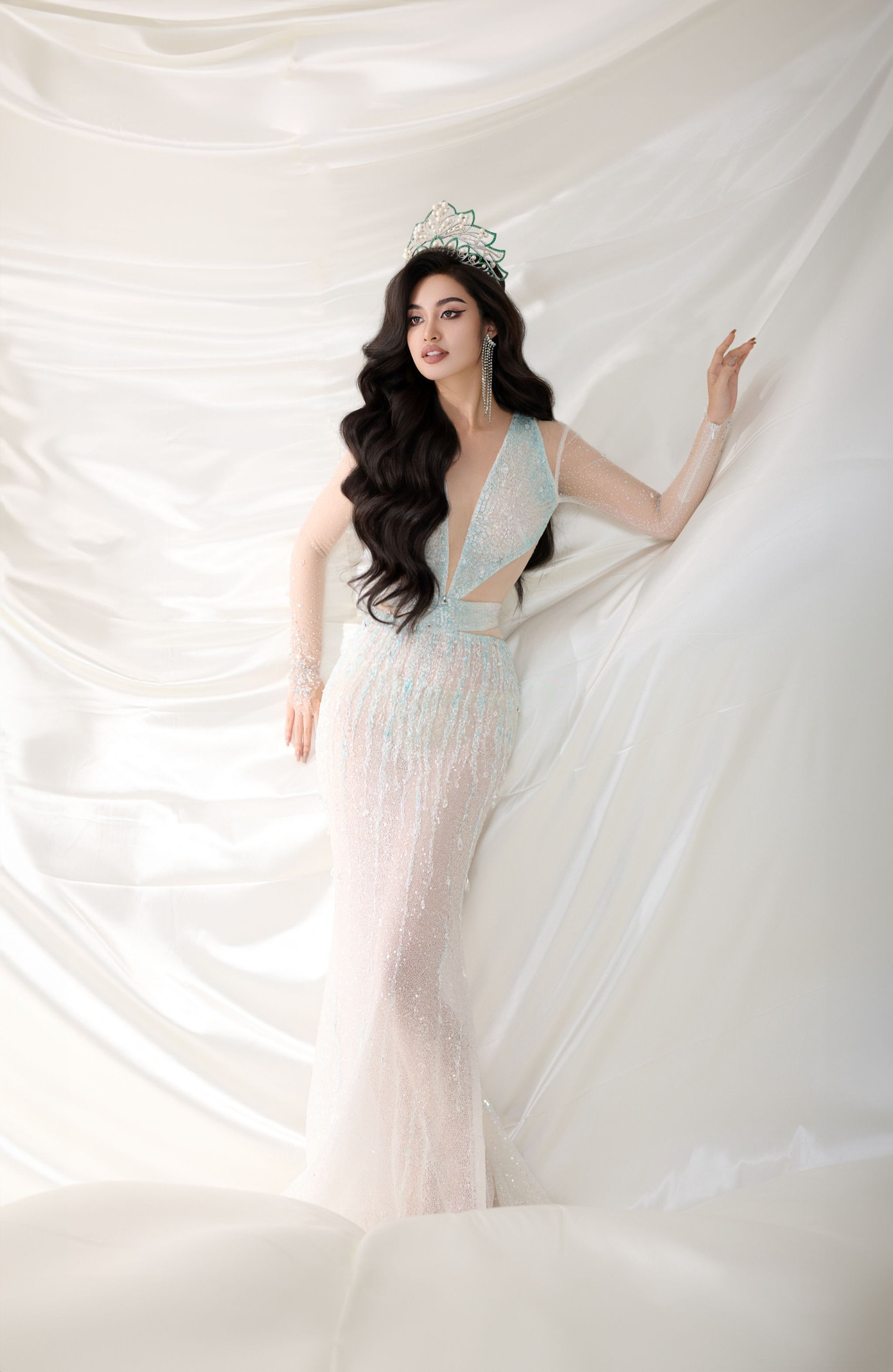 Trong bộ ảnh mới trước khi chinh chiến quốc tế, Nông Thúy Hằng đã khoe nhan sắc kiêu sa, với vương miện Hoa hậu Các dân tộc Việt Nam 2022 có trị giá 3 tỷ đồng. Trong bộ ảnh này, cô diện thiết kế dạ hội đính kết cầu kỳ với những đường cut out táo bạo, khoe vòng eo săn chắc và vóc dáng gợi cảm.