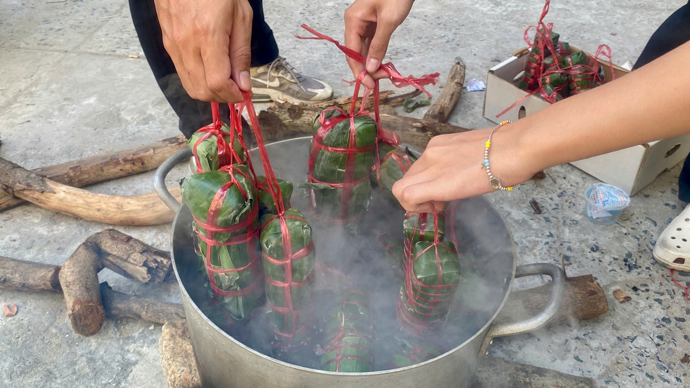 | Sau khi gói xong bánh, các bạn sinh viên cùng luộc bánh. |