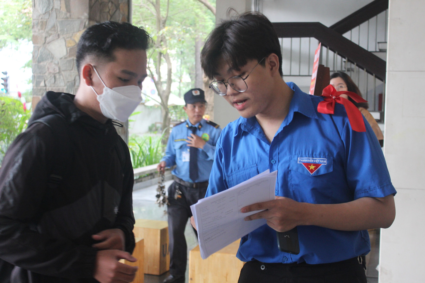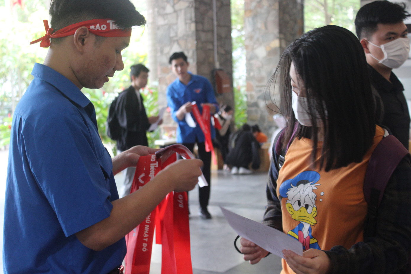 | Để hỗ trợ chương trình hiến máu Chủ nhật Đỏ, các bạn cộng tác viên của Đoàn trường đã chuẩn bị mọi khâu: từ chuẩn bị bàn ghế, sắp xếp chỗ cho sinh viên điền đơn đăng ký, hỗ trợ nhập liệu và trao giấy chứng nhận, tặng quà những sinh viên hiến máu xong. Mộc Hoa, sinh viên năm nhất chia sẻ: “Được hỗ trợ công tác cho ngày hội hiến máu Chủ nhật Đỏ tụi mình rất vui. Càng vui hơn khi thấy rất đông các bạn sinh viên đăng ký tham gia chương trình. Có nhiều bạn chưa kịp hiến nhưng vẫn vui vẻ ra về đợi những lần sau”. |