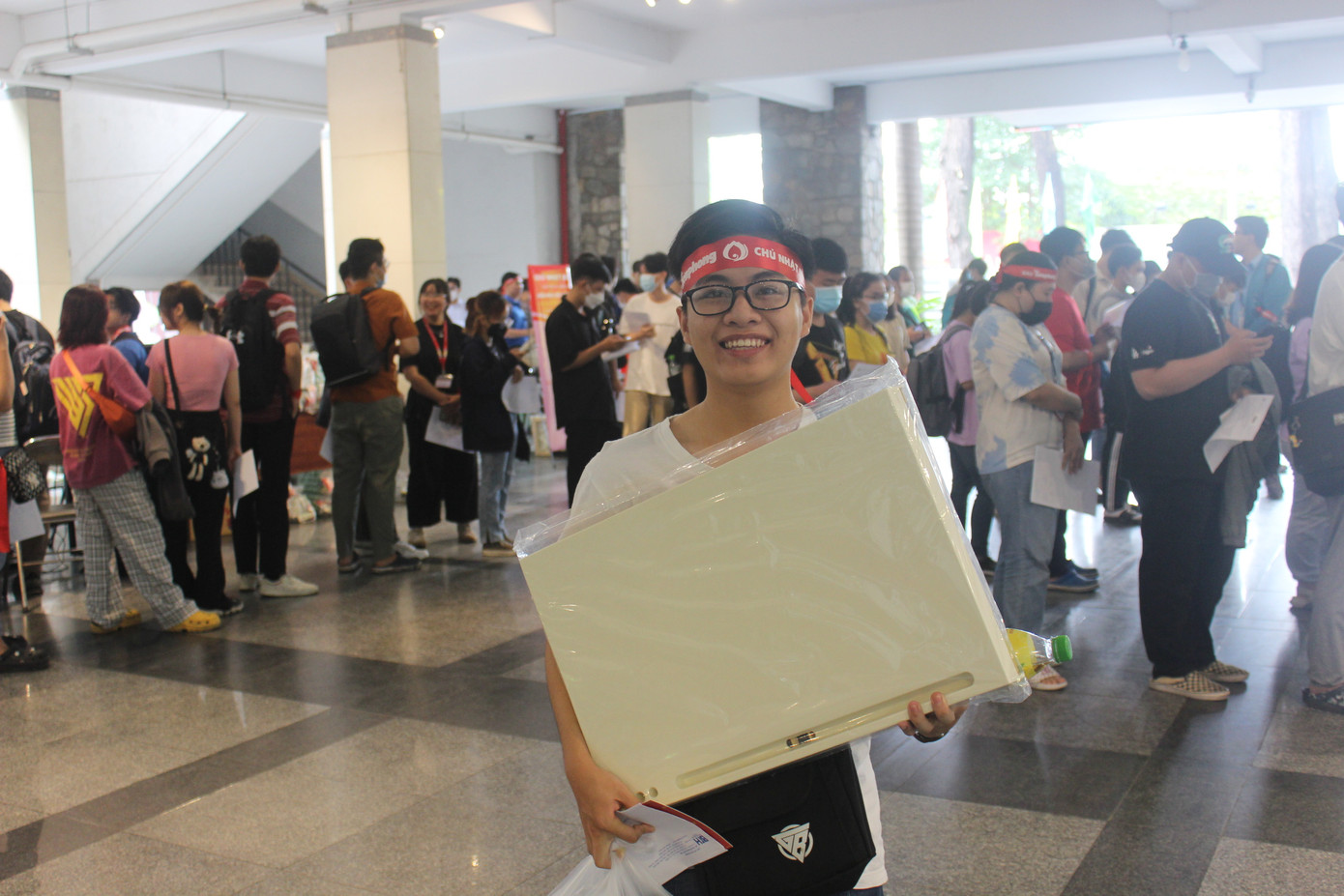 | Sau khi hiến máu, các bạn sinh viên nhận giấy chứng nhận và nhận quà từ Ban Tổ chức. |