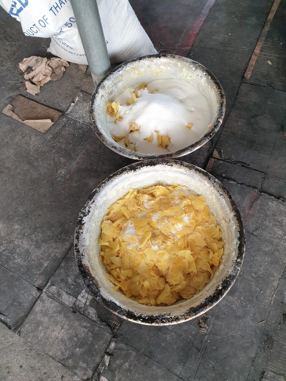 | Gừng củ còn tươi sau khi gọt vỏ, thái mỏng và rửa sạch được ngâm với nước cốt chanh khoảng nửa giờ để tạo độ vàng, sau đó vớt ra rổ để ráo. Gừng thái lát cho vào nồi luộc vừa chín, không luộc quá kỹ. |