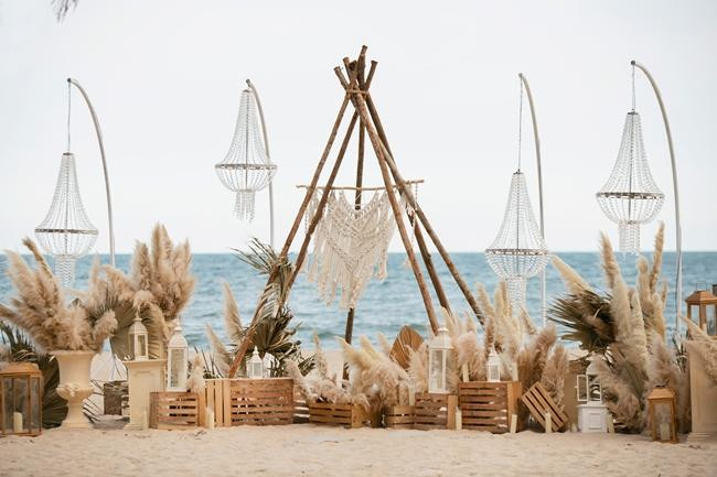 Bên cạnh đó, với việc tổ chức ngoài biển thì Hằng muốn những đồ trang trí phải có sự đung đưa, hòa nhịp với gió trời chứ không phải những bông hoa rực rỡ nhưng đứng yên một chỗ. Điều này cũng tượng trưng cho cá tính của cô dâu, rất mạnh mẽ nhưng không kém phần uyển chuyển”.