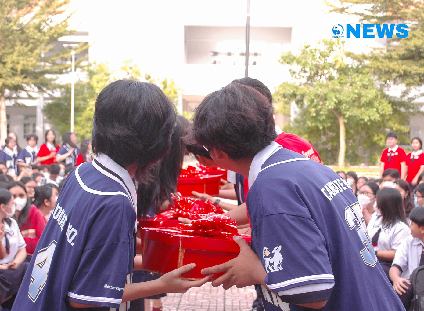 Đầu mỗi tuần trong năm học, thần dân trường sẽ được cháy hết mình trong chiếc áo đồng phục lớp để biểu diễn tiết mục chào cờ với các “bạniuơi” cùng trường. Bạn Hà Gia Mẫn (lớp 12AV2) thổ lộ: “Vì là lần cuối được biểu diễn cùng nhau rồi nên ngại gì mà không quẩy, lớp mình đã cùng song kiếm hợp bích với lớp 12AV1 để mang đến tiết mục 10-điểm-không-có-nhưng!”.